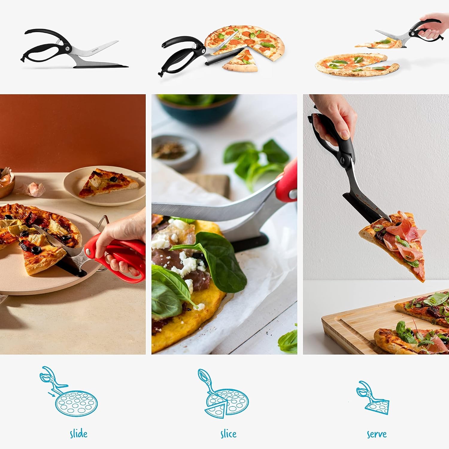 - AT YOUR SERVICE | No matter the pizza's size, it’ll be in perfect bite-sized slices in no time. The kitchen scissors glide through thick crusts thanks to the sharp edges and easy slicing action. It has a safety-lock and is dishwasher safe
