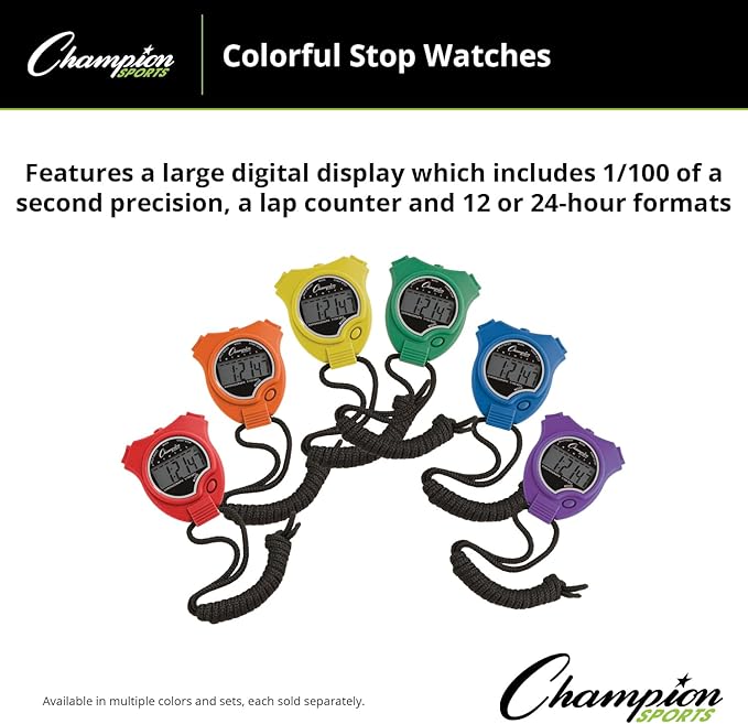 Champion Sports Stopwatch Timer Set: Waterproof, Handheld Digital Clock Sport Stopwatches with Large Display for Kids or Coach - Bright Colored 6 Pack