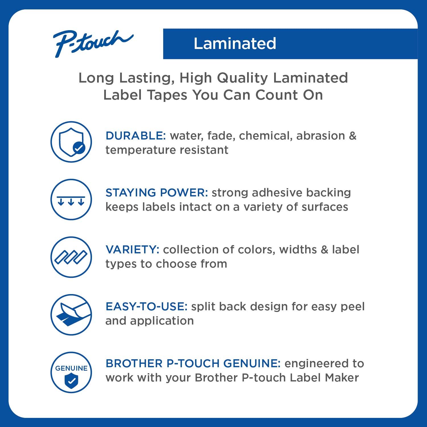 - Stays strong: Brother adhesive label tape stays strong but can be removed without leaving any residue. These adhesive laminated tapes are also safe for photo-labeling and scrap-booking.