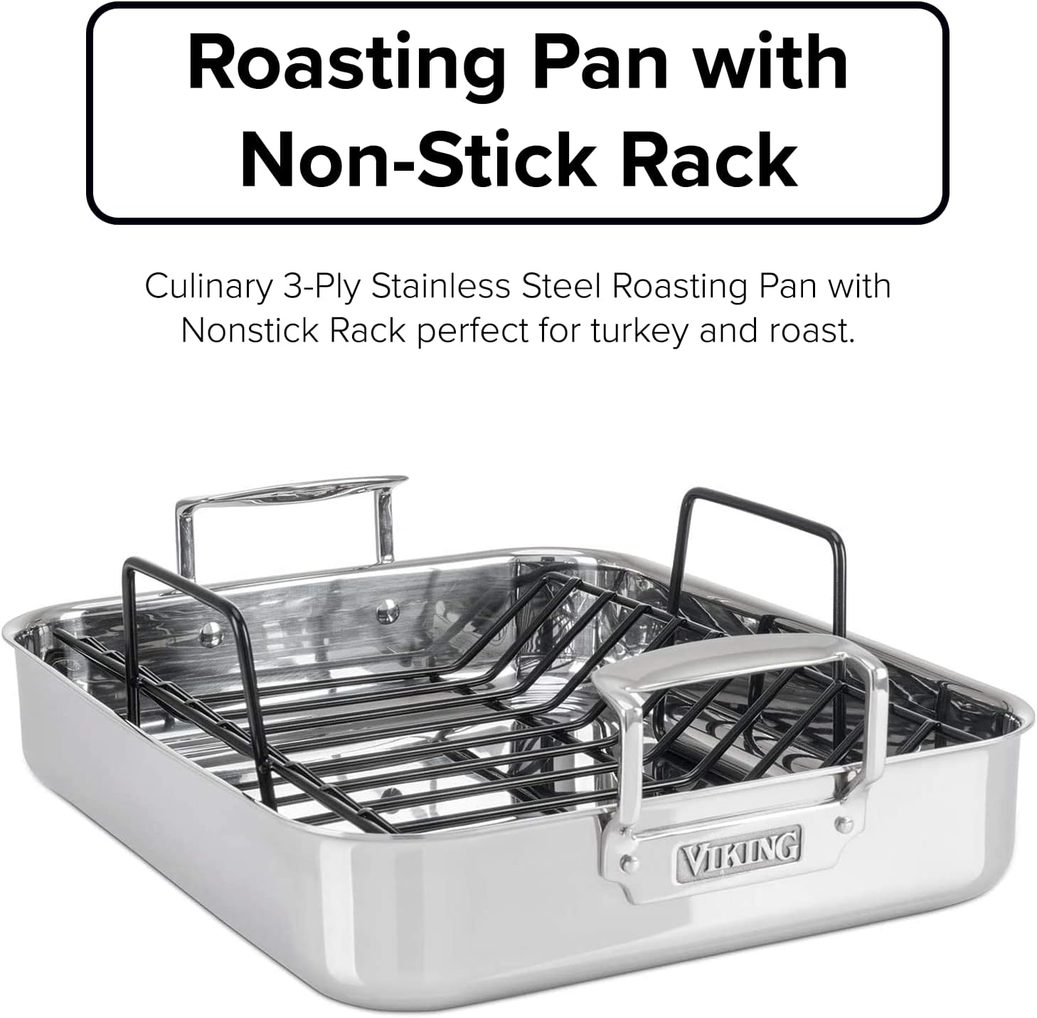 - ROASTER PAN WITH NONSTICK RACK: Prepare a juicy turkey or a tender roast with the Viking Stainless Steel Roasting Pan wth Nonstick Rack! Perfect for home cooks, this roasting pan features an elevated v-shaped nonstick wire rack which helps cook food quicker and more evenly; cooking surface is non-reactive and ideal for reducing sauces or liquids