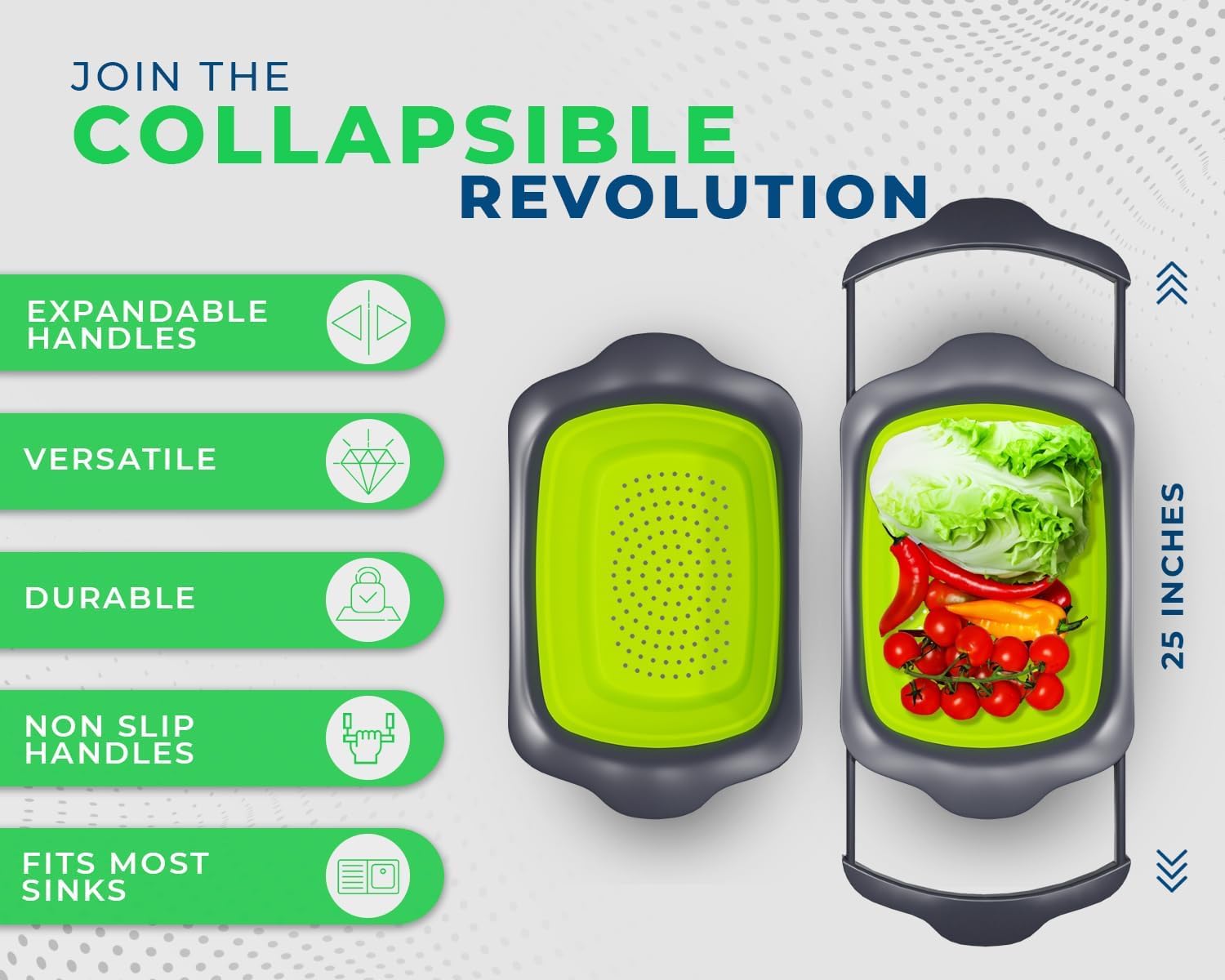 XL Large Kitchen Strainer by Comfify - Collapsible Silicone Over-The-Sink Colander with Extendable Handles - Use with Pasta, Fruit, Berries & Veggie - 6 Quart - Green
