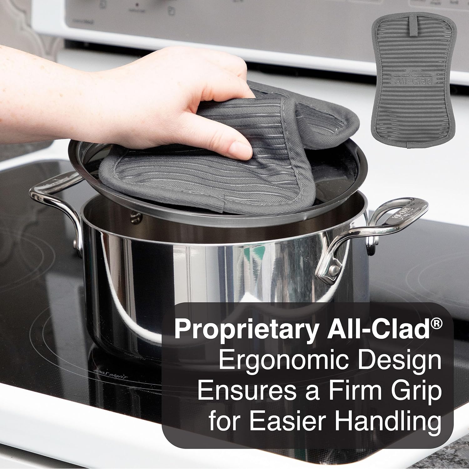 - MAXIMUM HEAT PROTECTION. All-Clad Pot holders with silicone grip offer heat resistance up to 500 degrees Fahrenheit (260 degrees Celsius). Having a reinforced thumb area made of fire resistant fibers means your hands will be protected when grabbing hot items from the oven or grill.