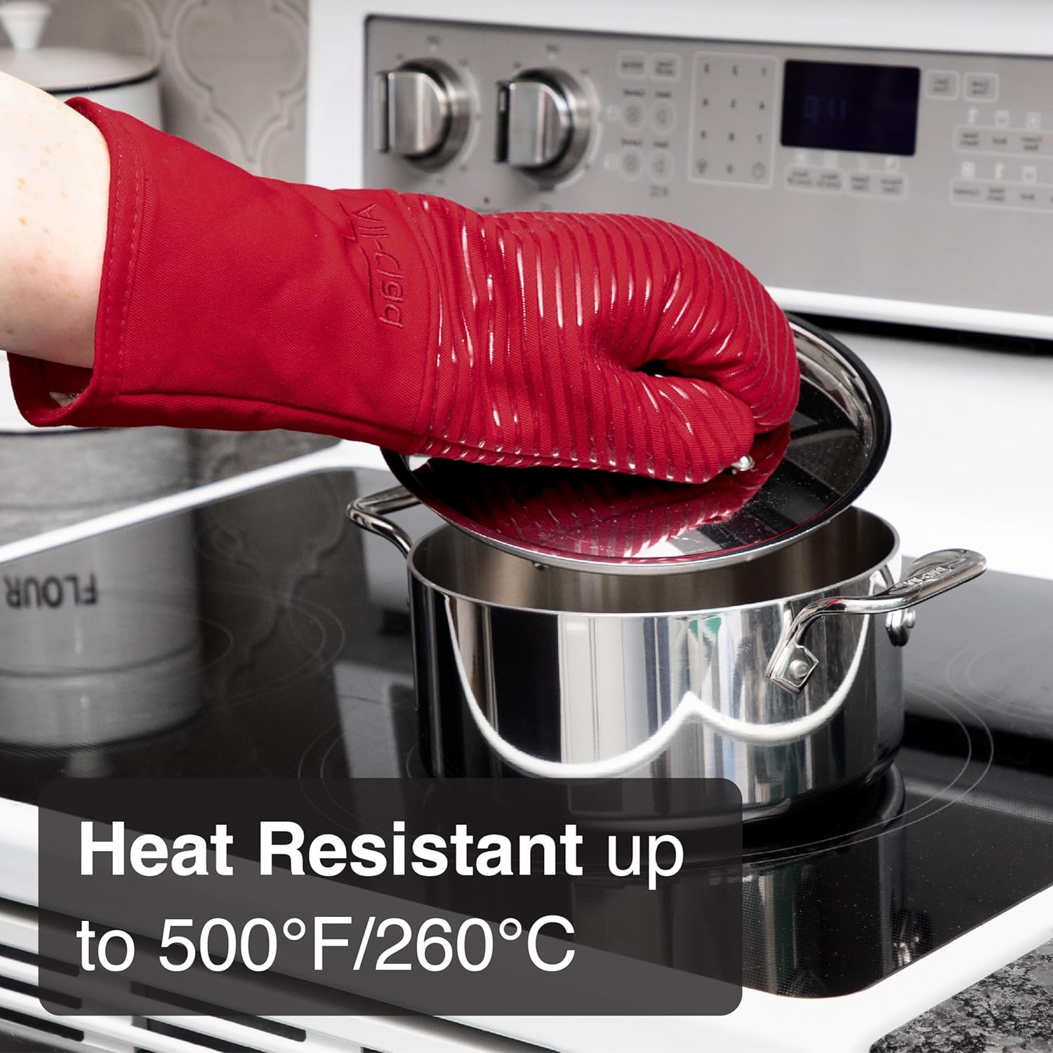All Clad Silicone Oven Mitt: Heat Resistant up to 500 Degrees - 100% Cotton & Silicone, 14"x7" Oven Mitt for Kitchen and Barbeque, 1-Pack, Chili