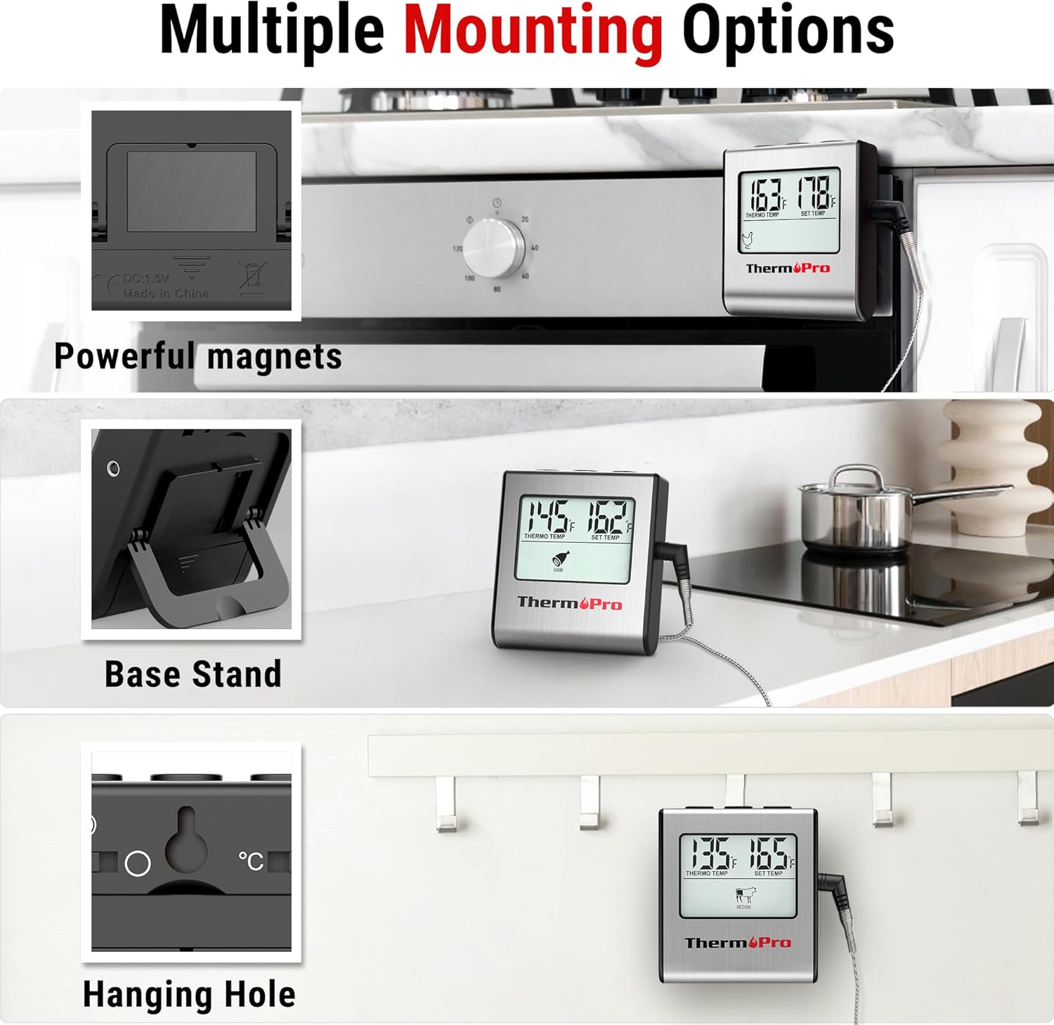 ThermoPro TP16 Large LCD Digital Cooking Food Meat Thermometer for Smoker Oven Kitchen BBQ Grill Thermometer Clock Timer with Stainless Steel Temperature Probe