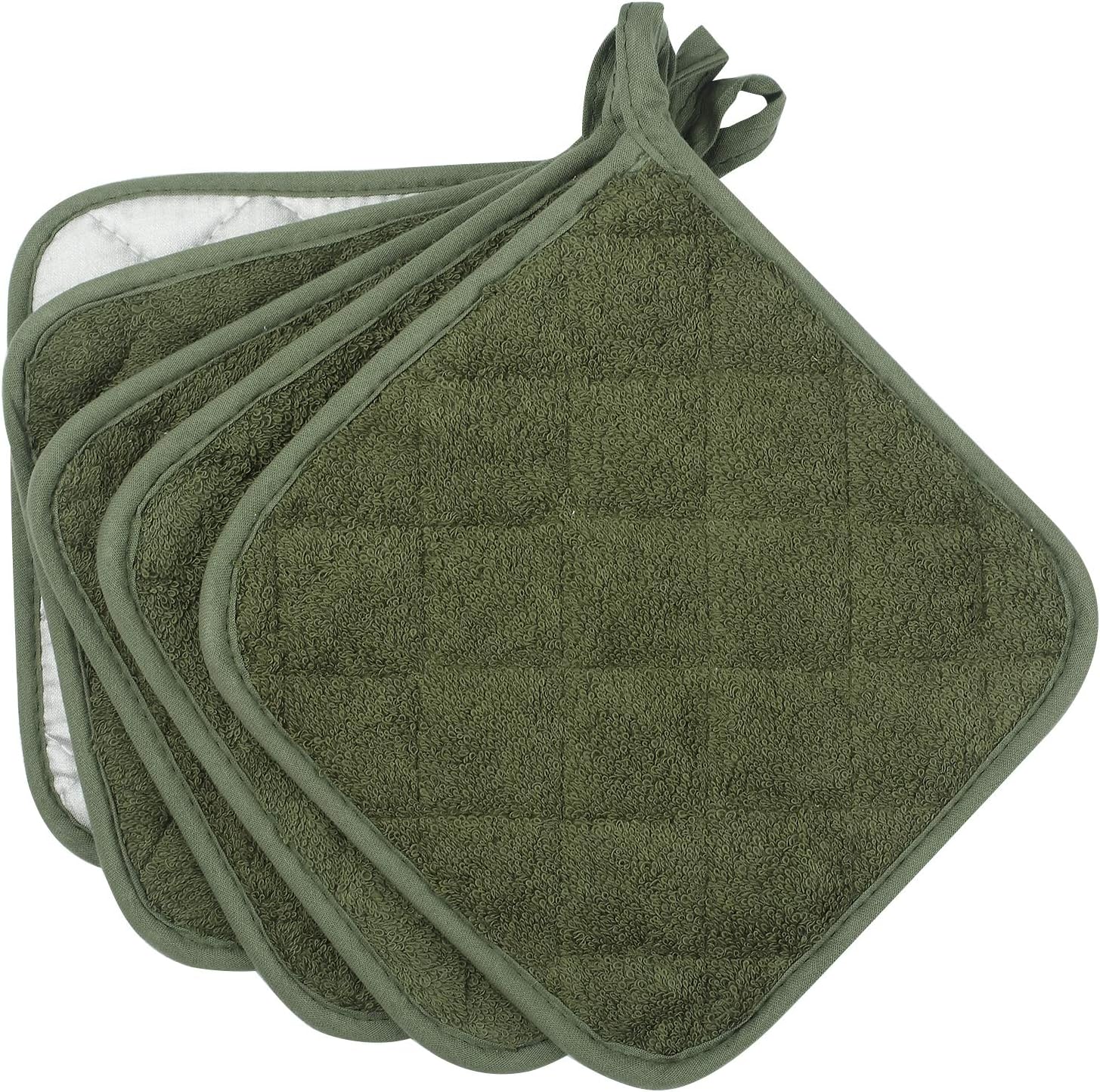 100% Cotton Kitchen Everyday Basic Terry Pot Holder Heat Resistant Coaster Potholder for Cooking and Baking Set of 5 Olive Green