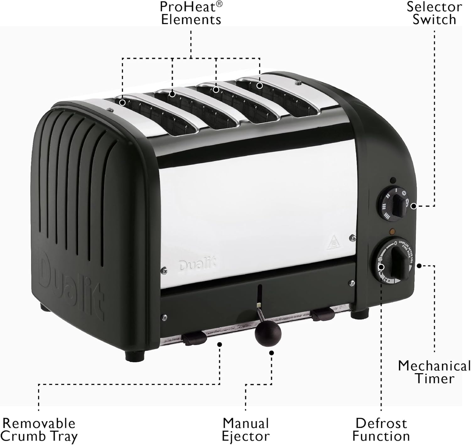 Dualit Classic 4 Slice NewGen Toaster - Stainless Steel - Hand Built in the UK - Replaceable ProHeat elements - Defrost Bread - Mechanical Timer - Matt Black Classic Toaster