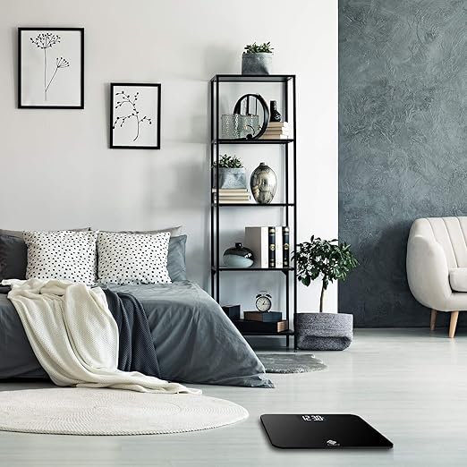 • Easy to Use & Round Corner Design-Immediate readings as soon as you step on the bathroom scale; Auto-off , Auto-zero, Auto-calibration; Low battery and overload indication; measures in both lb and kg, Sleek-looking rounded corners spare household members from sharp edges