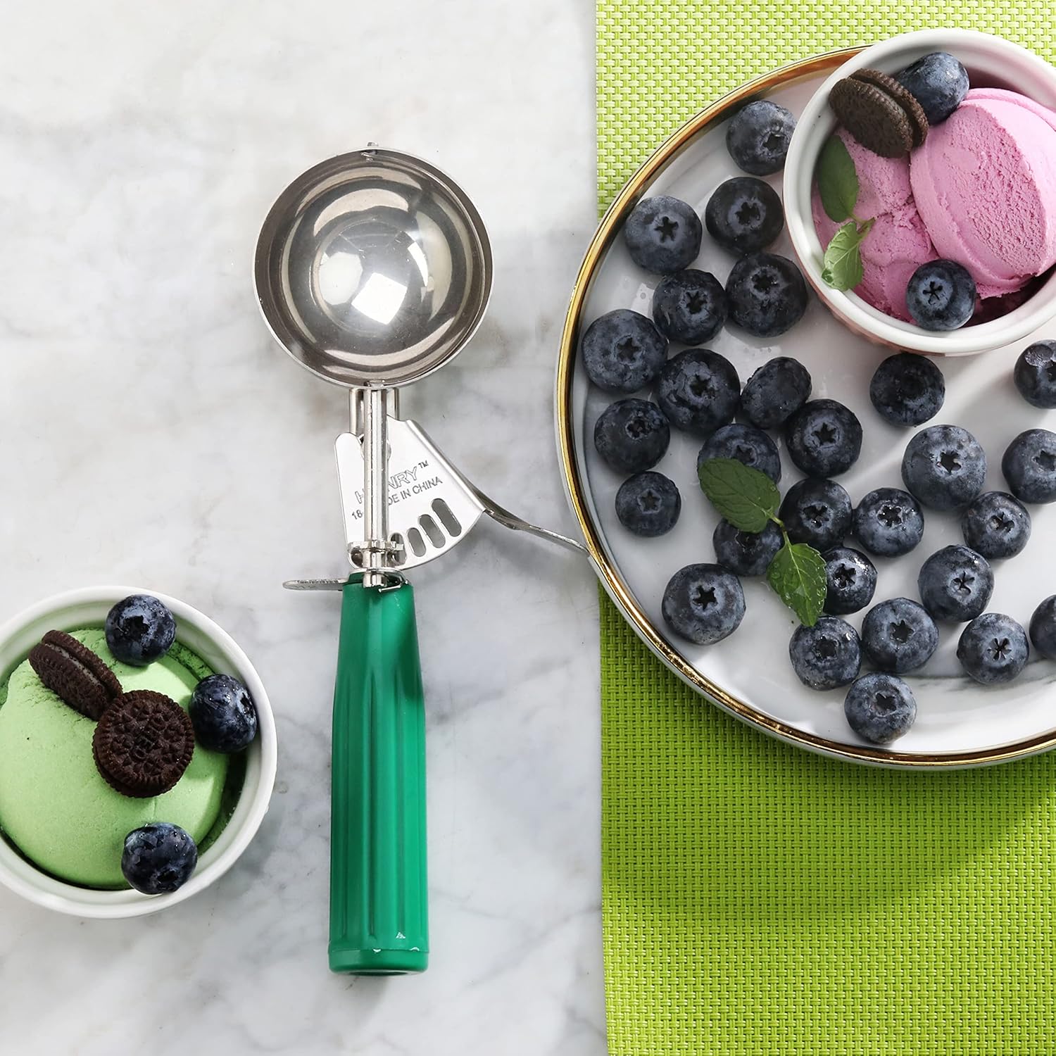 New Star Foodservice 34806 Commercial-Grade Thumb Press Food Disher/Ice Cream Scoop, 18/8 Stainless Steel, 3.25 oz, Size 12, Green