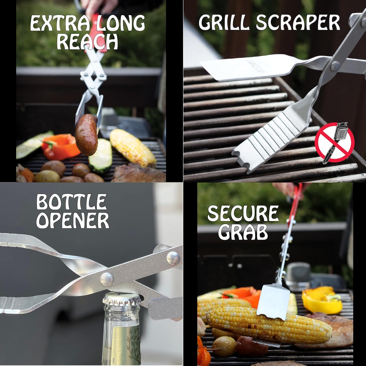 - EFFICIENT DESIGN The scissor mechanism opens wide (up to 9 inches) for precise grabbing, perfect for large pieces or deep lobster pots. The DUAL SPATULA LOCKING SYSTEM provides perfect control while flipping. Ideal for large to extra-large grills. Perfect for the cottage, fire pits and as a gift idea. Also great for moving small logs in fire pits and charcoal in a barbecue. A great GIFT IDEA for your BBQ lover!