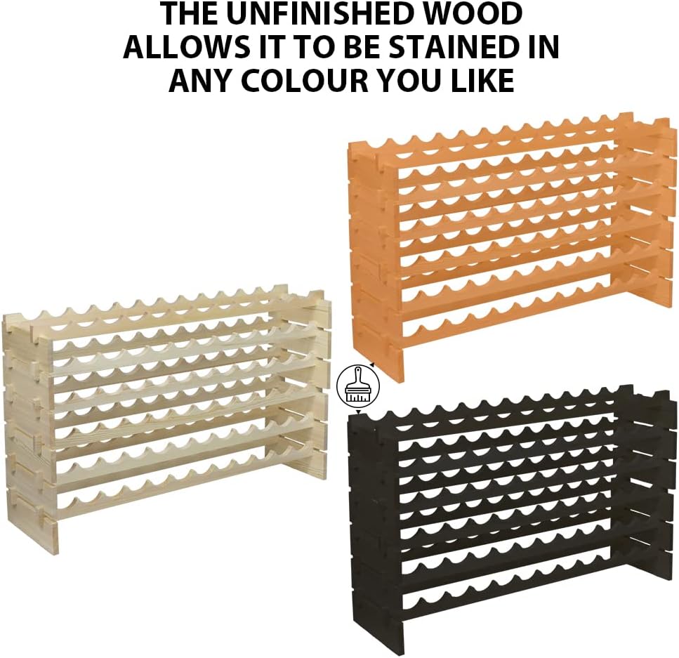 - 【Solid Pine Wood - Sturdy & Wobble-Free】This wine bottle holder is made of high quality knots free pine wood to ensure sturdy construction and compact capacity. The thickness of this hardwood is 0.71 inch, smooth and solid material to ensure your wines' safety for long time usage. Unfinished natural wood offers a variety options to stain, paint, varnish to match your furnishings or just leave as it is, 100% DIY and wobble-free guarantee