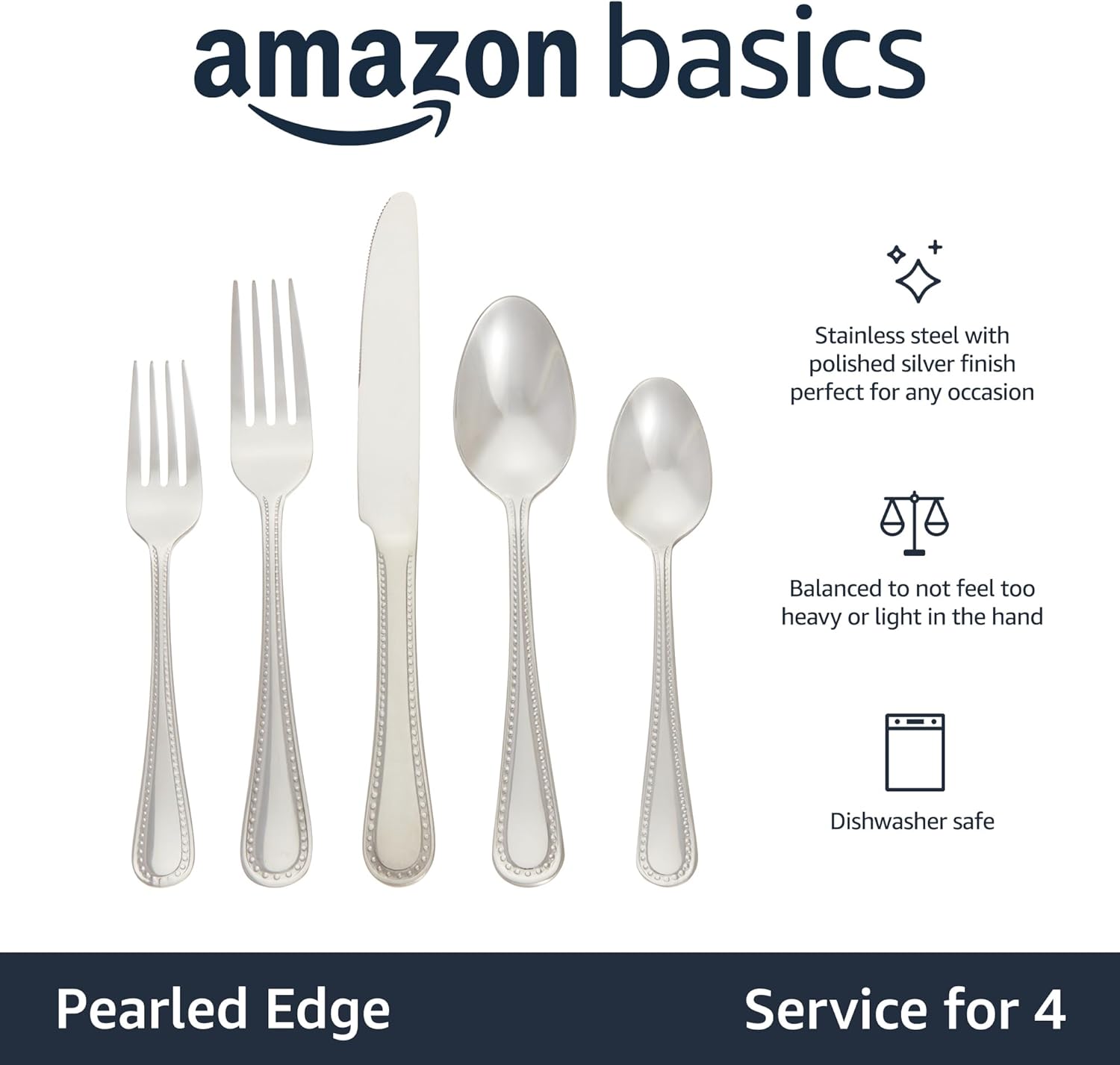 Amazon Basics Silverware Set, Stainless Steel Flatware, Dishwasher Safe, Service for 4, 20-Piece Forks and Spoons, Pearled Edge