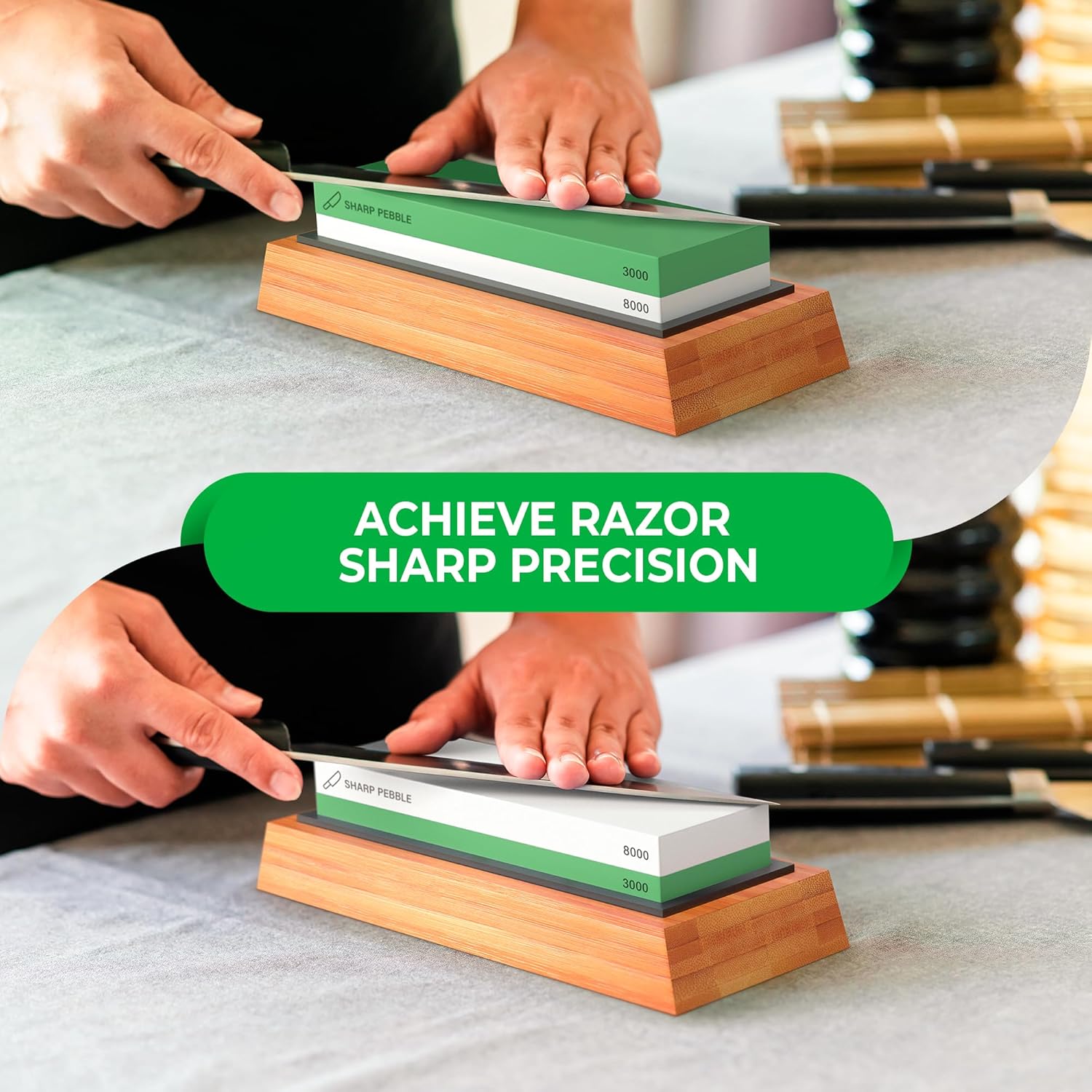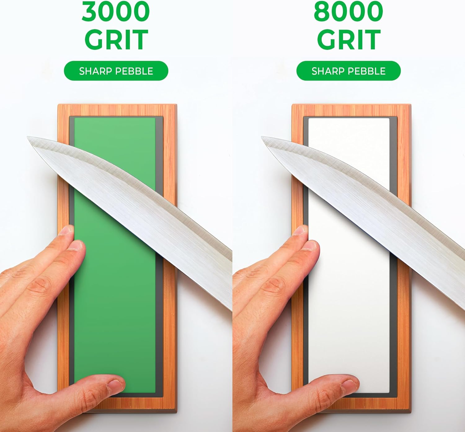 Sharp Pebble Premium Whetstone Knife Sharpening Stone 2 Side Grit 3000/8000 Wetstone Kit -Wetstone Kitchen Knife Sharpener with Non-Slip Bamboo Base & Flattening Stone