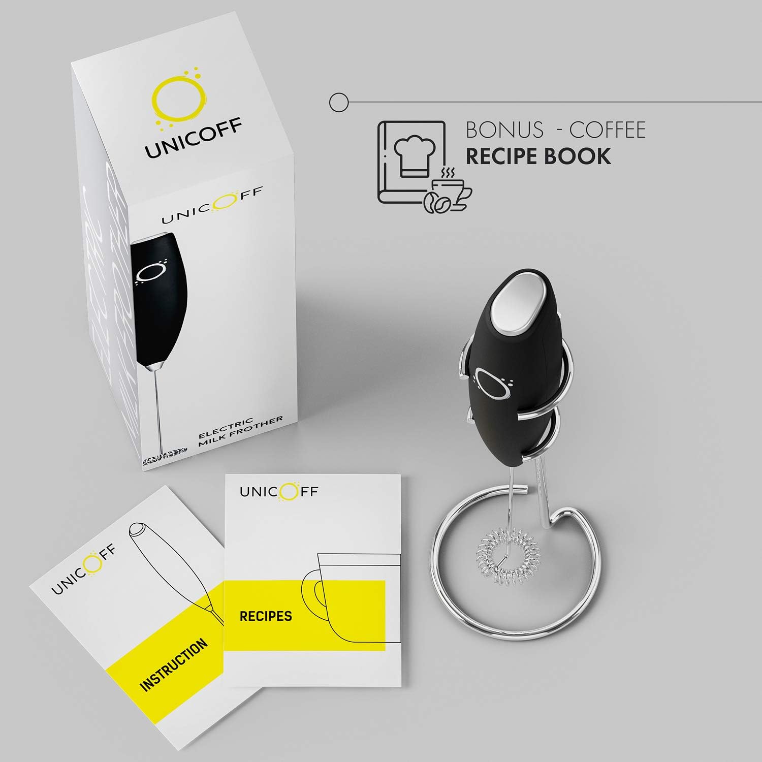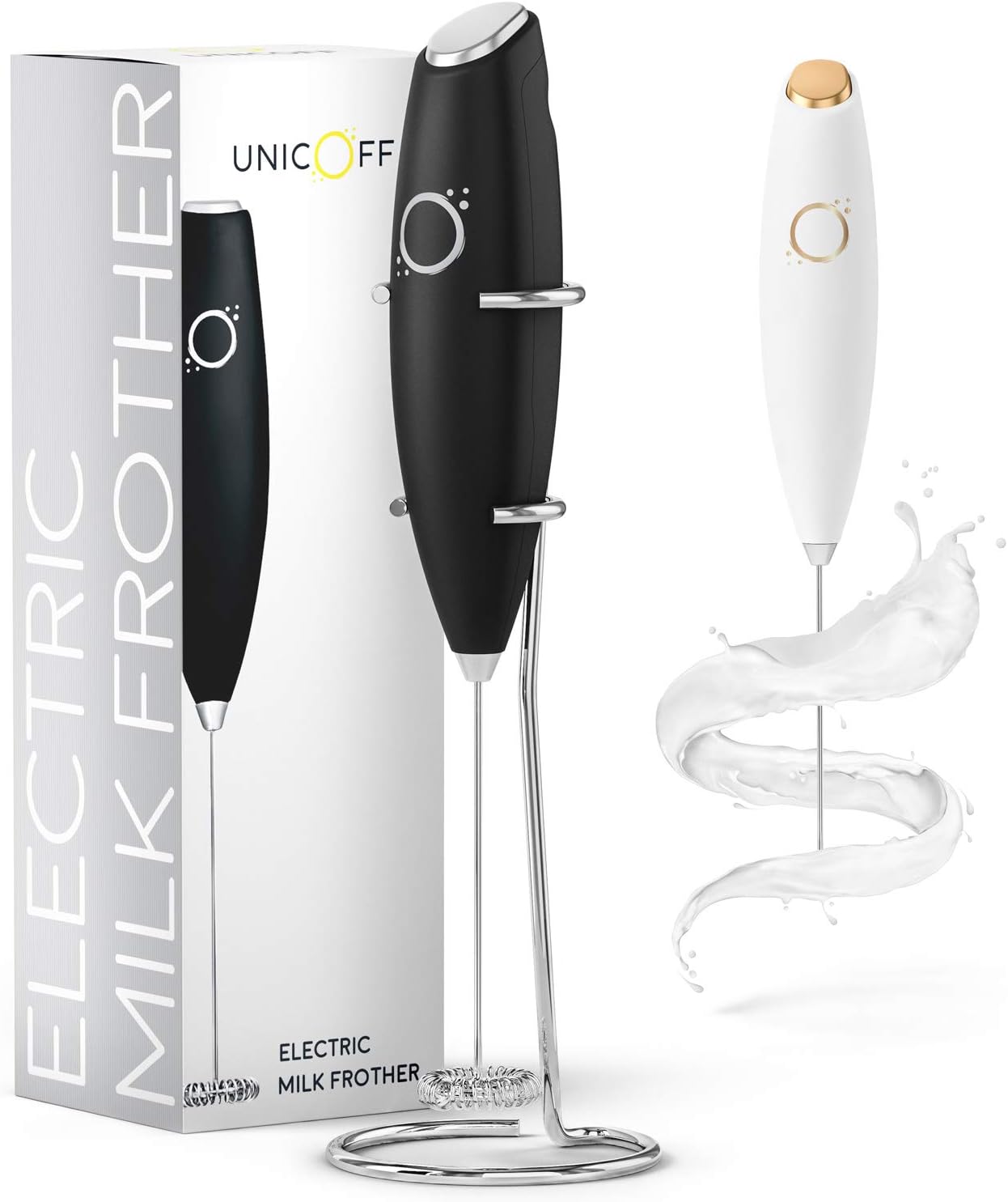 - WITH ITS CHIC, UNDERSTATED DESIGN, the Unicoff Electric Milk Frother with Stand makes a gorgeous addition to your kitchen countertop or COFFEE STATION. Whether you choose our White & Gold or Black & Chrome milk foamer, you’ll love how this LUXE handheld frother compliments your kitchen decor