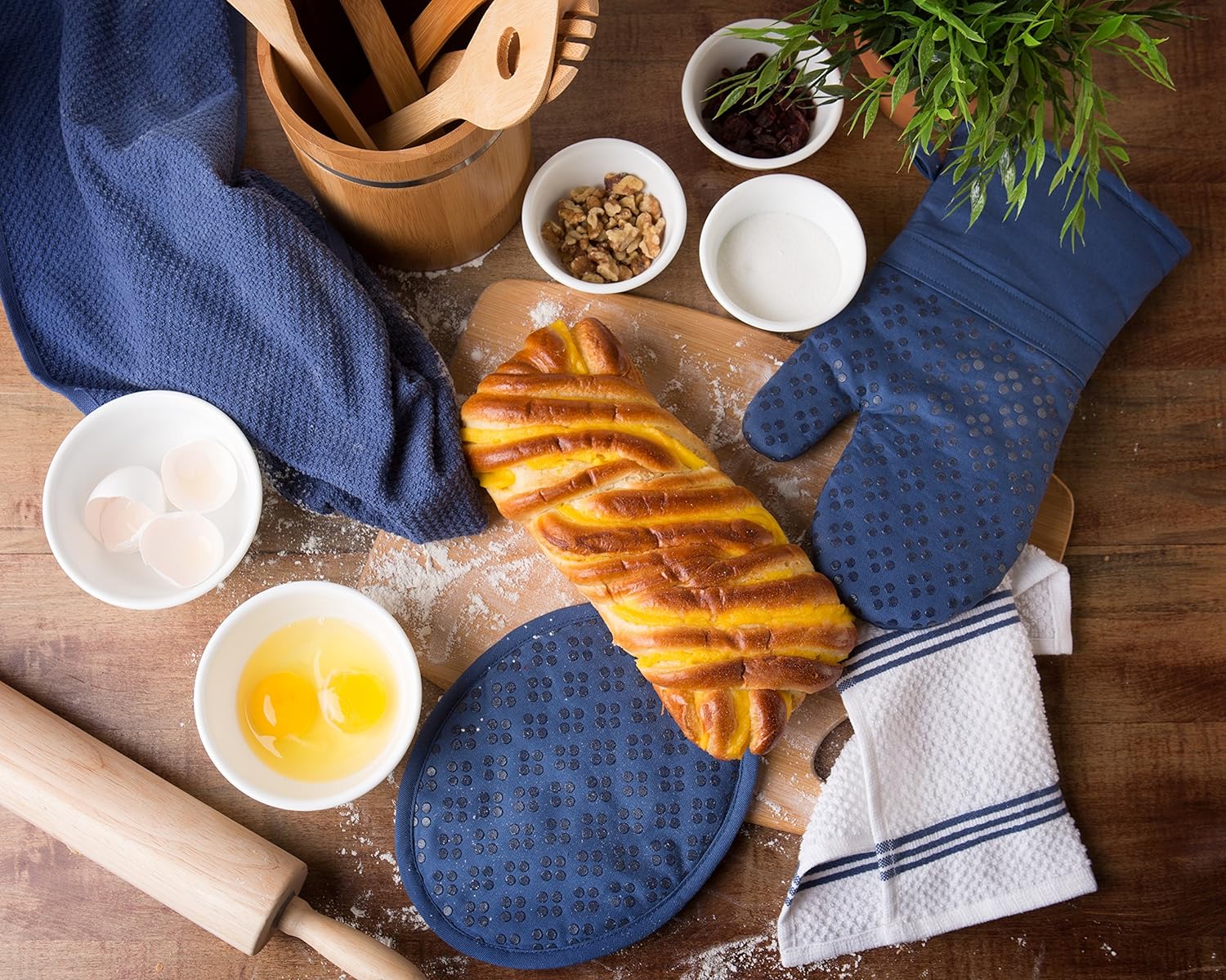 Sticky Toffee Oven Mitt and Pot Holder Set of 3 – Dark Blue Non-Slip Silicone Kitchen Hot Pads and Mitts, 100% Cotton Shell, Oeko-Tex Cotton