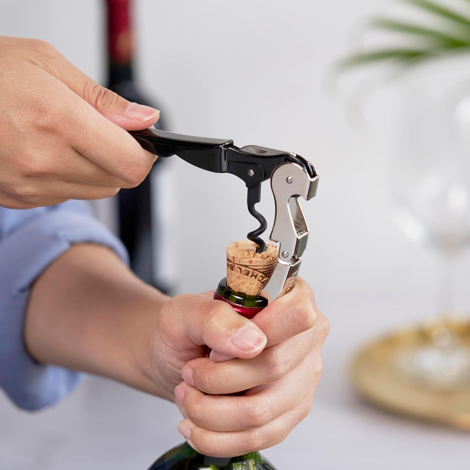 - DURABLE AND EASY TO USE - Our waiter's corkscrew is double-hinged for better leverage and has a comfortable curved grip, wine bottle foil cutter, and a bottle opener for bottle caps. It's made from stainless steel and easily fits in a pocket.