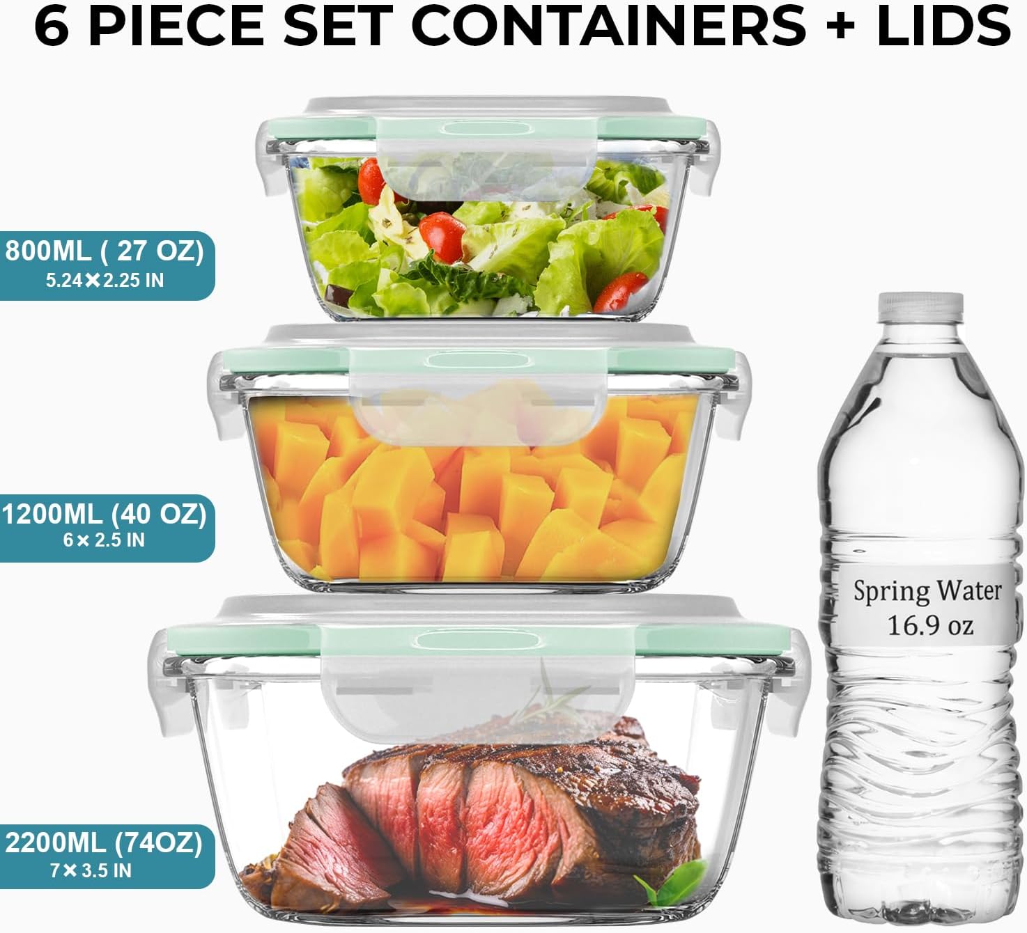 - Six piece square glass storage containers - Razab set of three large glass food storage containers with lids includes a variety of sizes 2200ml (74 oz), 1200ml (40 oz), and 800ml (27 oz) square glass containers with snap-locking lids. Whether itโs meal prep, lunch, or leftovers, this container set has you covered.