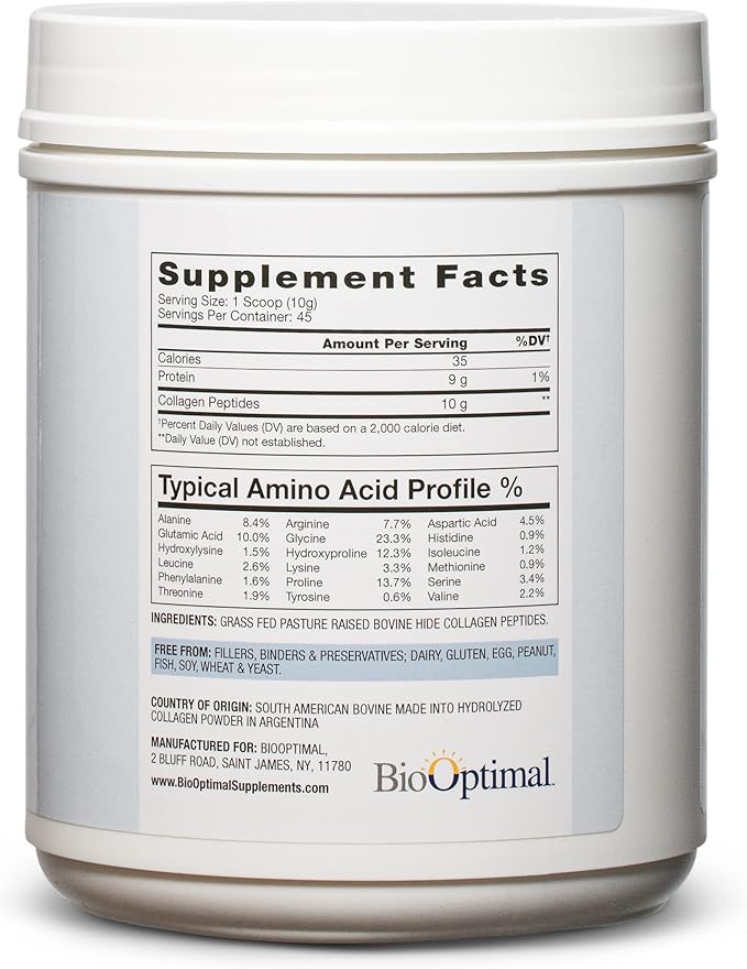 • UNFLAVORED: BioOptimal Collagen Peptides Powder uses a formula with an unflavored taste and no additives, making it perfect for adding to water, smoothies, or any other drink.