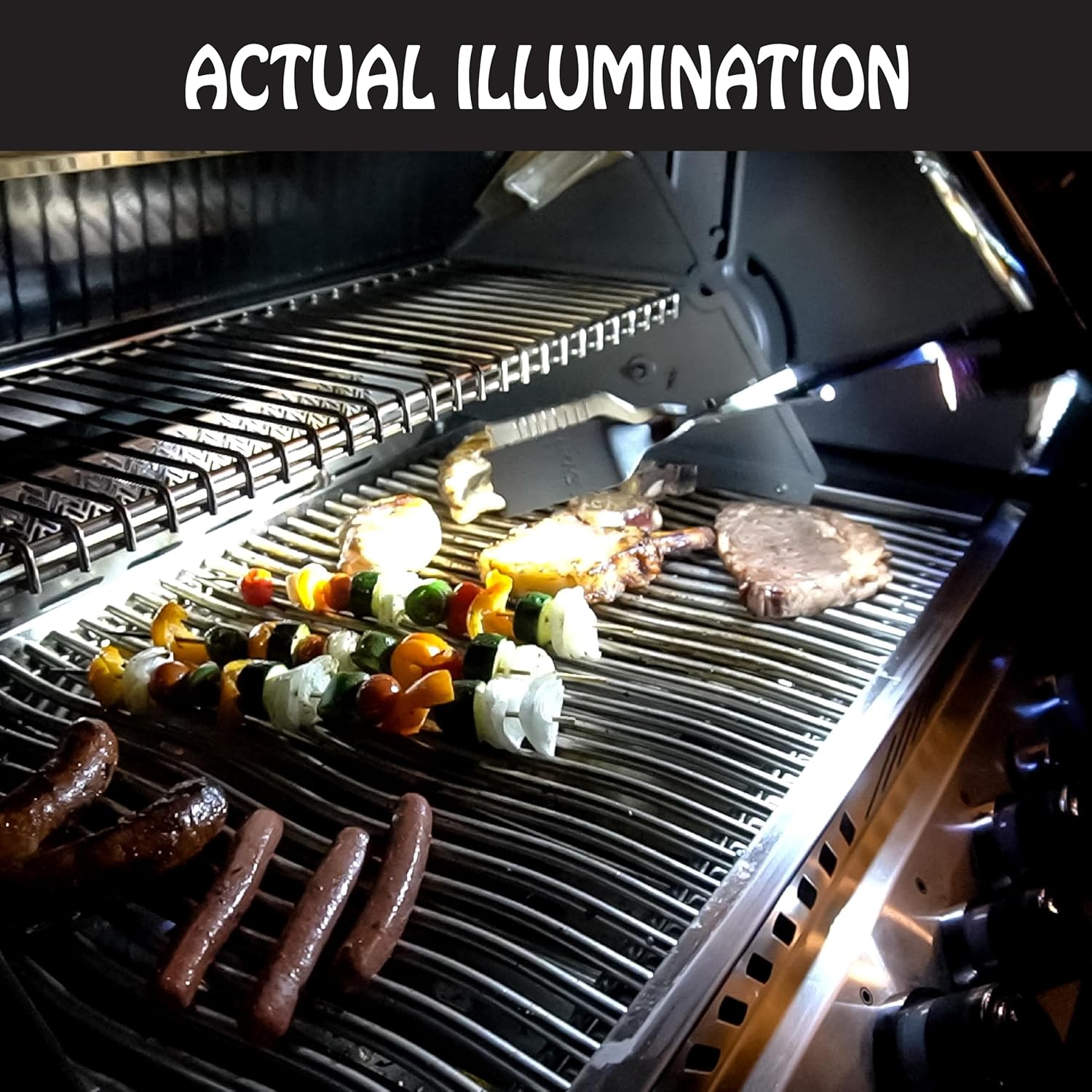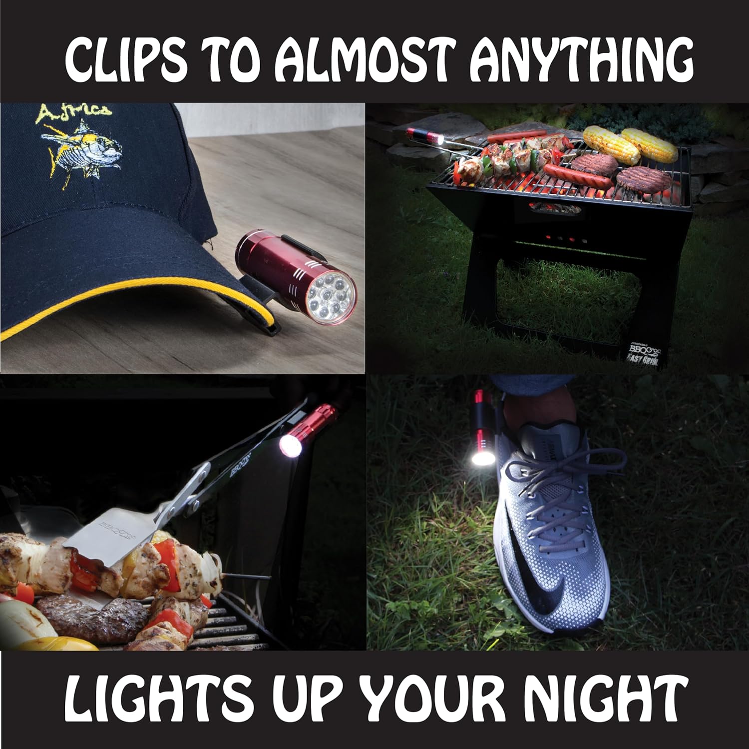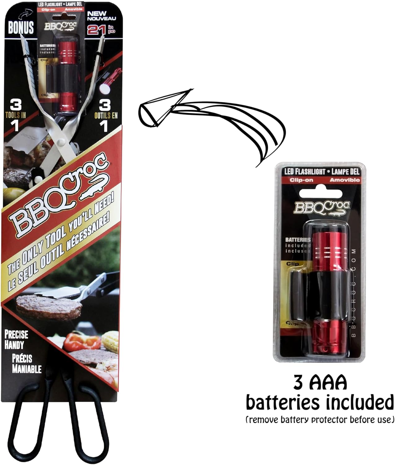 - LET THERE BE LIGHT! Extend your grilling day and season with the INCLUDED CLIP-ON Flashlight, PACKED INSIDE THE SHIPPING BOX. Thermoplastic clip snaps to the BBQ Croc. Powerful 9 light LED flashlight shines brightly to illuminate the grill. 3 AAA batteries INCLUDED (remove the battery protector before use).