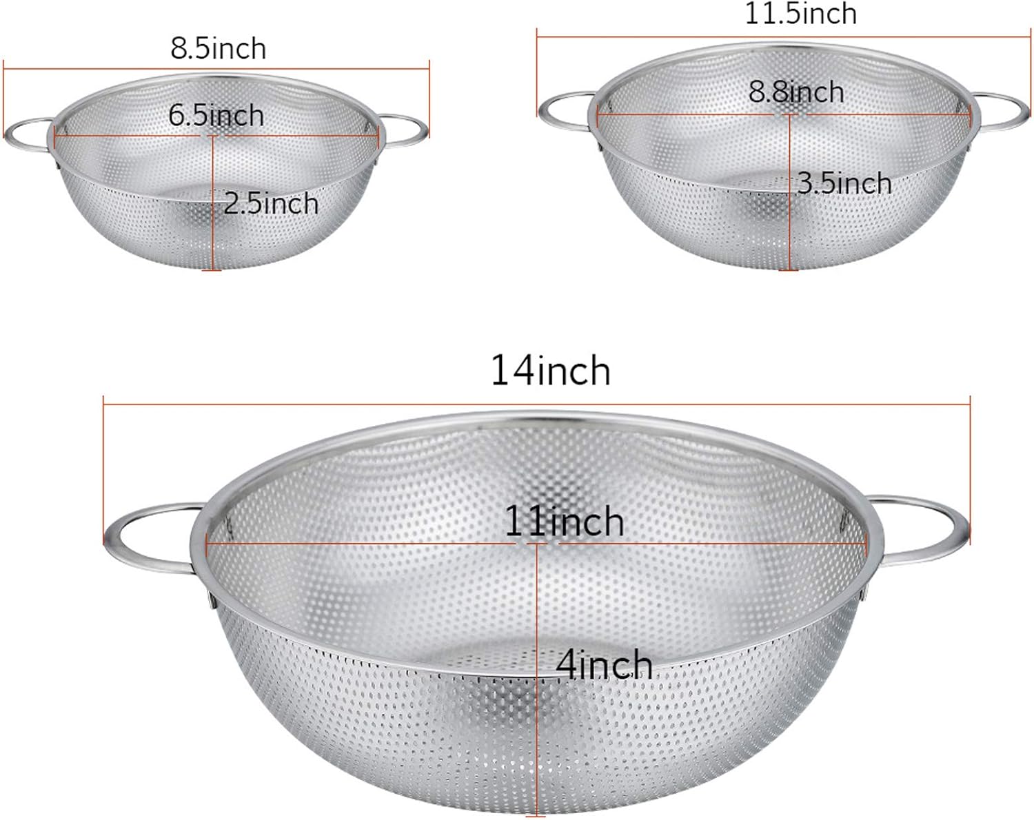 - 【THREE SIZES】3 sizes could meet your different cooking, straining and preparation needs, Large 11"W x 4"H (for family meal preparation), Medium 8.8"W x 3.5"H (for 2-3 person food preparation), Small 6.5” W x 2.5” H (for tiny fruit like raspberry)