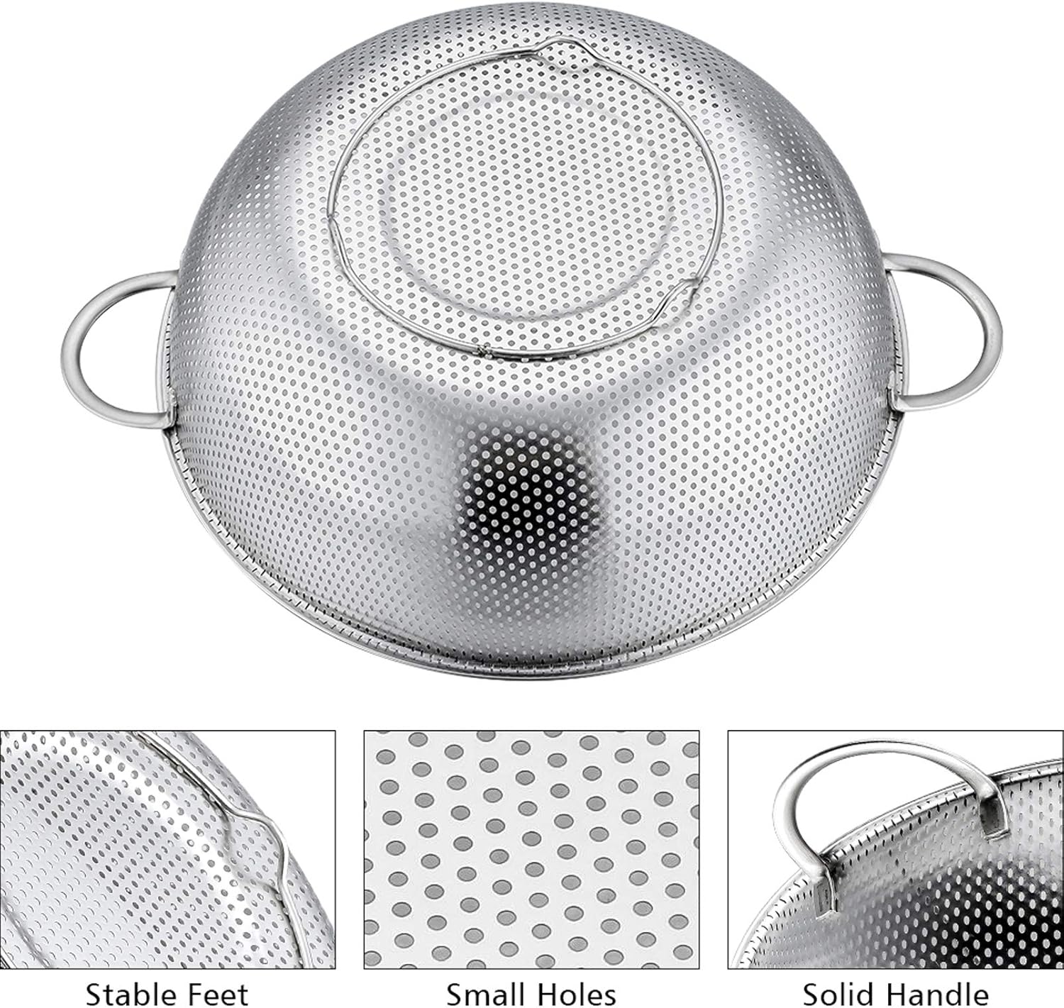 - 【SUPERIOR DESIGN】 Double handles for griping comfortably and holding heavy food easily, Triple 0.4-inch feet stand stably on the kitchen sink, Facilitate fast and easy drainage and free your hand, A great alternative to handheld spider strainer