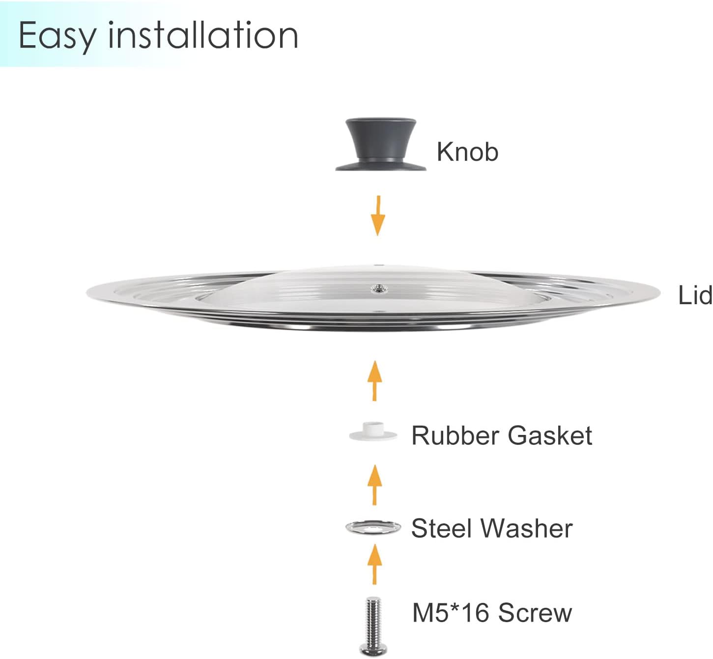 - Convenient Handle: Universal lid for pots and pans features a detachable heat-resistant silicone knob. Easy to grasp, no scald. Need to Assemble the Knob Yourself within 30 Seconds
