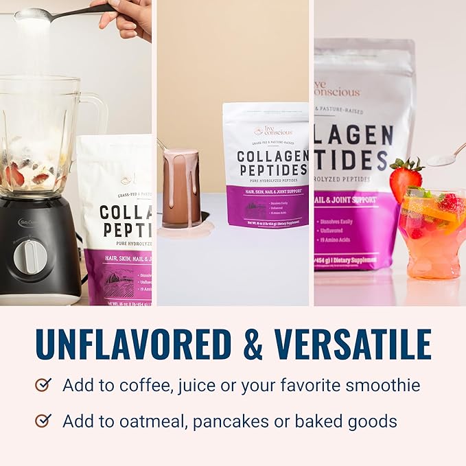 • Premium Ingredients — For the best results, you need the best ingredients. LiveConscious labs uses hydrolyzed collagen peptides from bovine sources certified as grass-fed and pasture-raised.