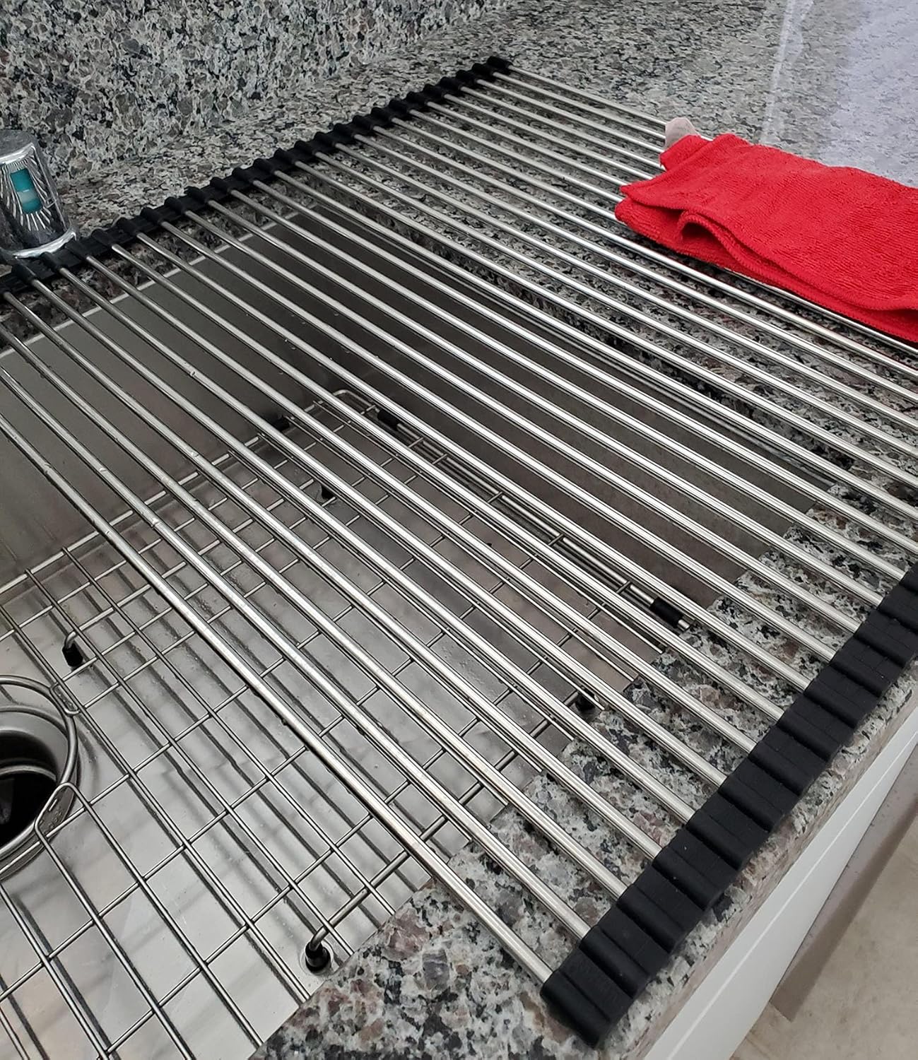 - Roll up Sink Drying Rack and Spacing-saving Dish Drying Mat: This dish drainer can roll up and go in a drawer quickly when not in use. Works great and keeps the kitchen sink area looking neat, the best one of dish drainers for kitchen counter. You can roll up this over the sink dish drying rack as much as you like during using it and for the pipes also can be removable