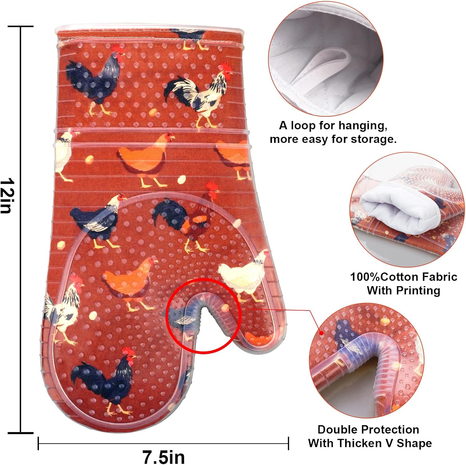 RED LMLDETA Oven Mitts Set of 2 with Transparent Clear Silicone Shell and Nice Shell Flower Cotton Lining, Heat Resistant to 500 F Kitchen Oven Gloves Pot Holder for Cooking (Rooster, Oven Mitts)