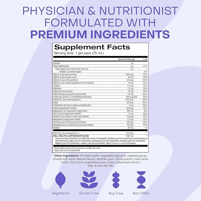 • All-in-One Formula Replaces 14 Pills: The future of vitamins is pill free. This physician and nutritionist formulated gel pack is a complete supplement with zinc, magnesium, antioxidants, and other essential nutrients to support overall vitality.