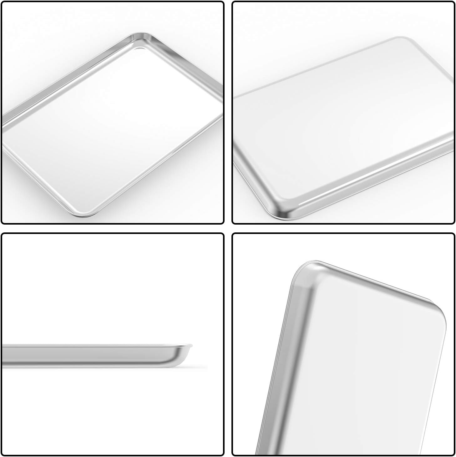 - Crafted: The cookie sheets have mirror finish to reduce the risk of food sticking; smooth roll edge make these stainless steel baking sheets comfortable to hold and transfer