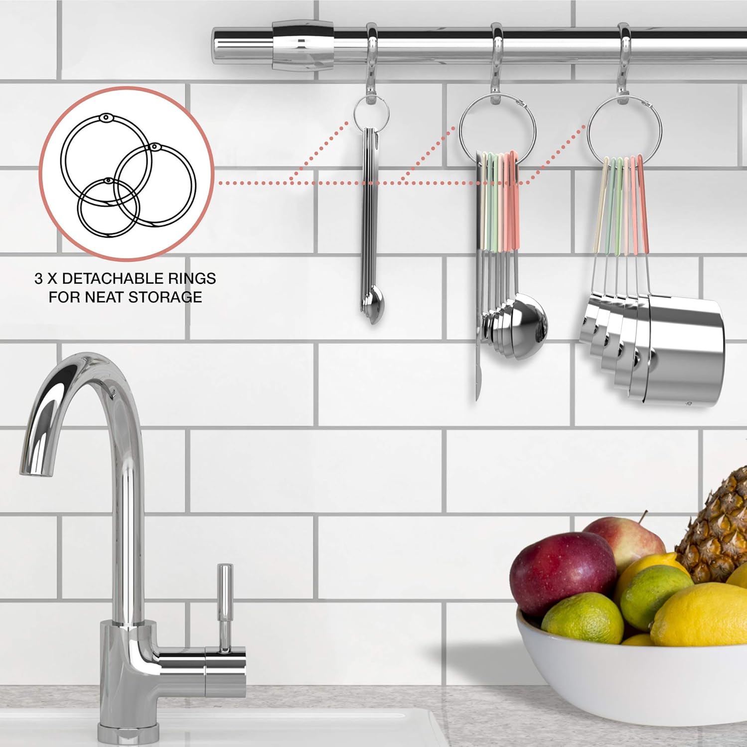 - The only set you will ever need - This versatile set of 22 pieces include: * 6 measuring cups (1/8 cup, 1/4 cup, 1/3 cup, 1/2 cup, 3/4 cup, and 1 cup) * 6 measuring spoons (1/8 tsp, 1/4 tsp, 1/2 tsp, 1 tsp; 1/2 tbsp and 1 tbsp) * 5 mini-measuring spoons (drop, smidgen, pinch, dash, and tad) * 1 cup- or spoon-leveling tool with mini-ruler * 1 fridge-magnet conversion chart * 3 round hinged rings. Whatever measurement you need, we got you covered.