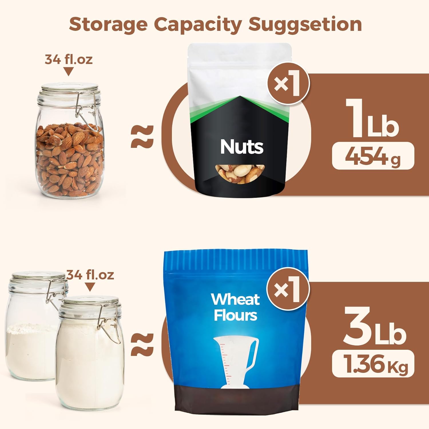 - Versatile Glass Container: The flour sugar storage containers can be a pickling jars for home and kitchen; It is good to preserve various food like jams, chutneys, flour, cereal, sugar, spices, nuts, tea, dried beans and your favourite snacks like biscuits