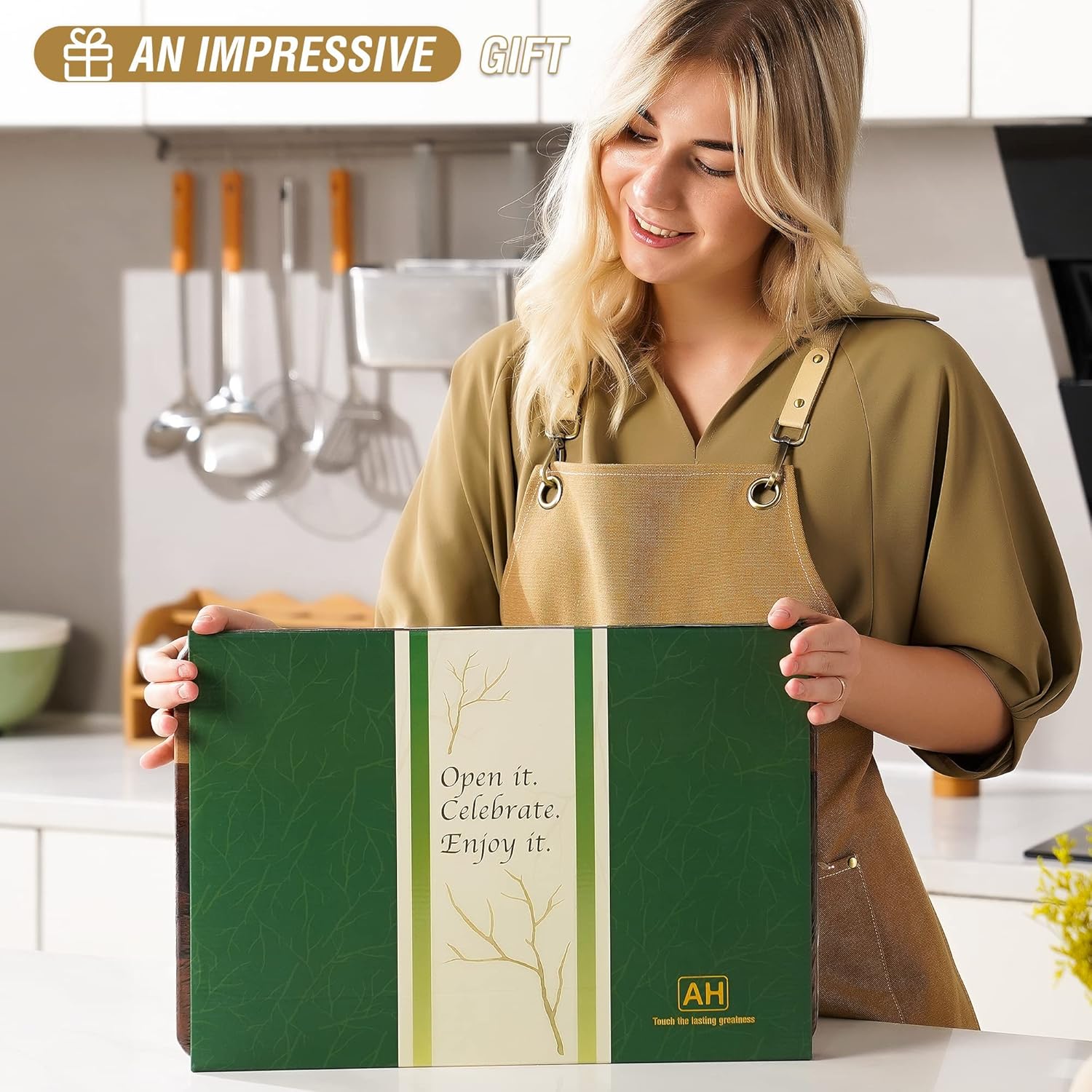 - Knife Friendly – This all-natural board has perfect solidity and softness to prevent from blunting your knives. As with all wood cutting boards, it may show some knife marks, but when cared for properly (instructions in the box) it will preserve the rich color and last longer.
