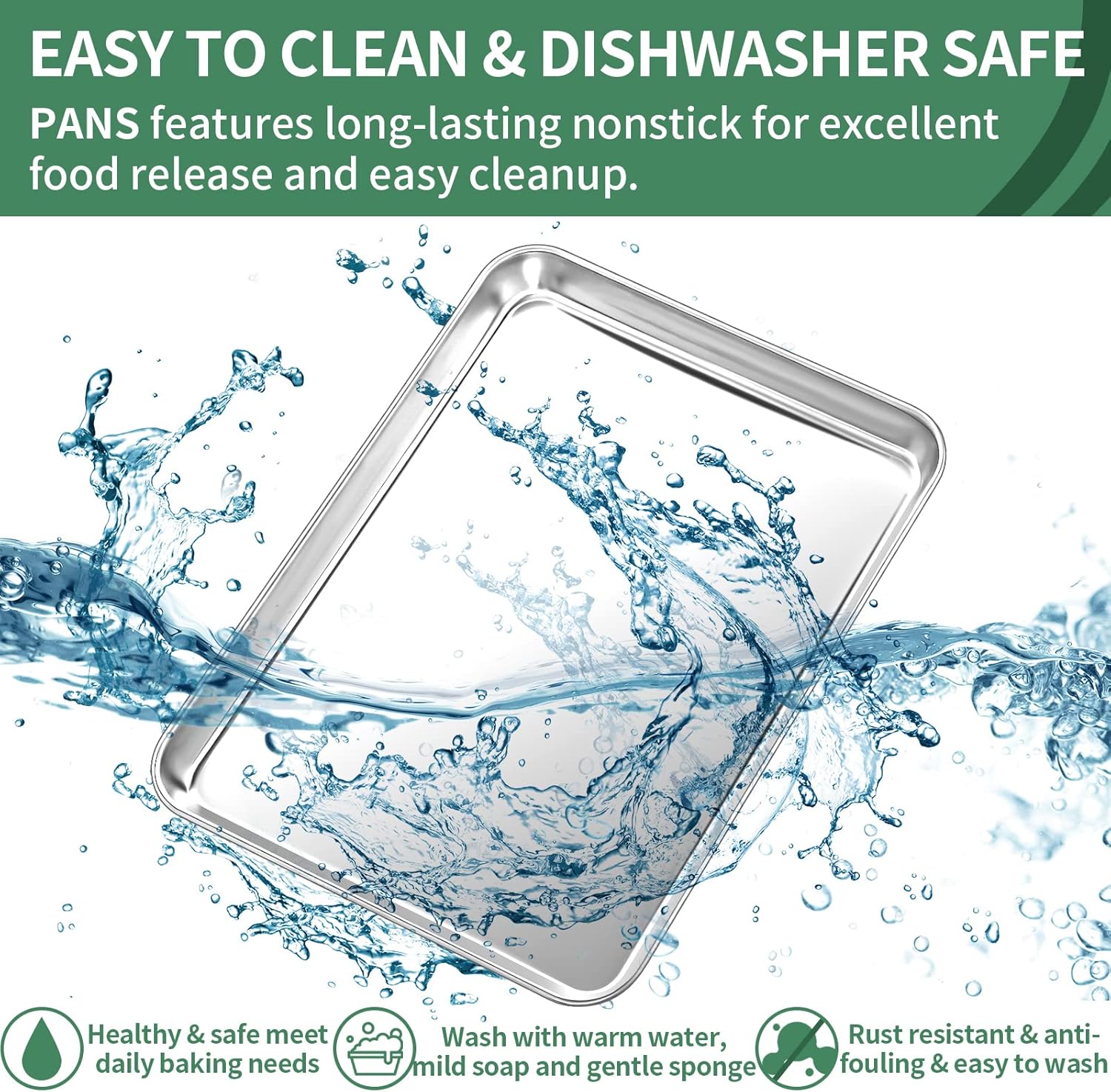 - Easy Clean & Leak-Proof & Nonstick: Nonstick stainless steel baking pans tray keep food contained and prevent food juice flowing everywhere, Keeping your oven neat. Dishwasher can save your time and labor after using.Easy to clean up even in hand-wash. Stainless steel cookies pan features long-lasting nonstick for excellent food release and easy cleanup