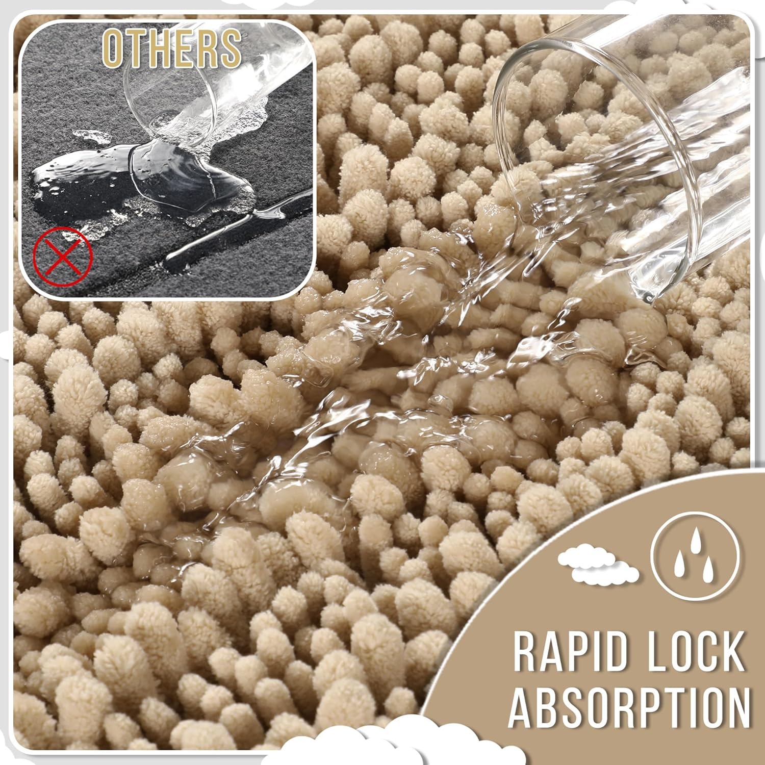 - Massive Water Absorption in Seconds: 5X faster than other materials mats, Yimobra bath mat absorbs 1000ml of water in 3 seconds. The vertical fiber channels lock moisture away from the surface, keeping your bathroom floor dry and discouraging damp environments. Perfect as a shower exit guard or sink splash catcher