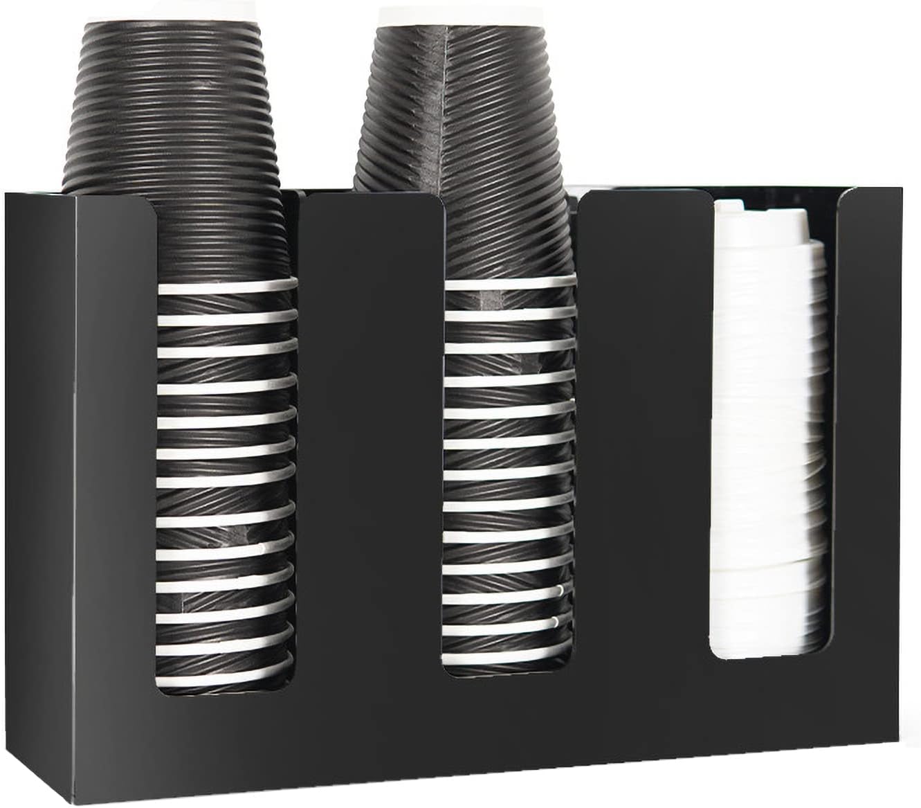 - Compact design fits on desks, countertops and tables. Our Coffee Cup and Lid Storage Organizer can be placed on the table or fixed to the wall according to your needs.