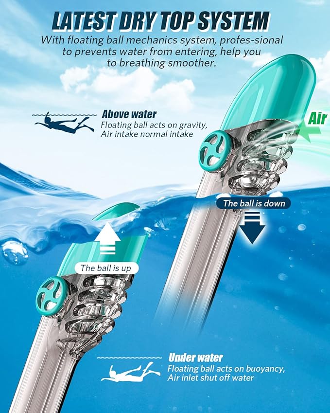 • PROFESSIONAL ANTI-FOG & ANTI-LEAK DESIGN: Separate inhaling and exhaling channels stop the top snorkel mask from fogging up, and anti-fog coating on the lens and anti-fog inserts guarantees anti-fog effect; Advanced leak-proof silicone sealing mask with floating ball prevents salty water from entering in mask.