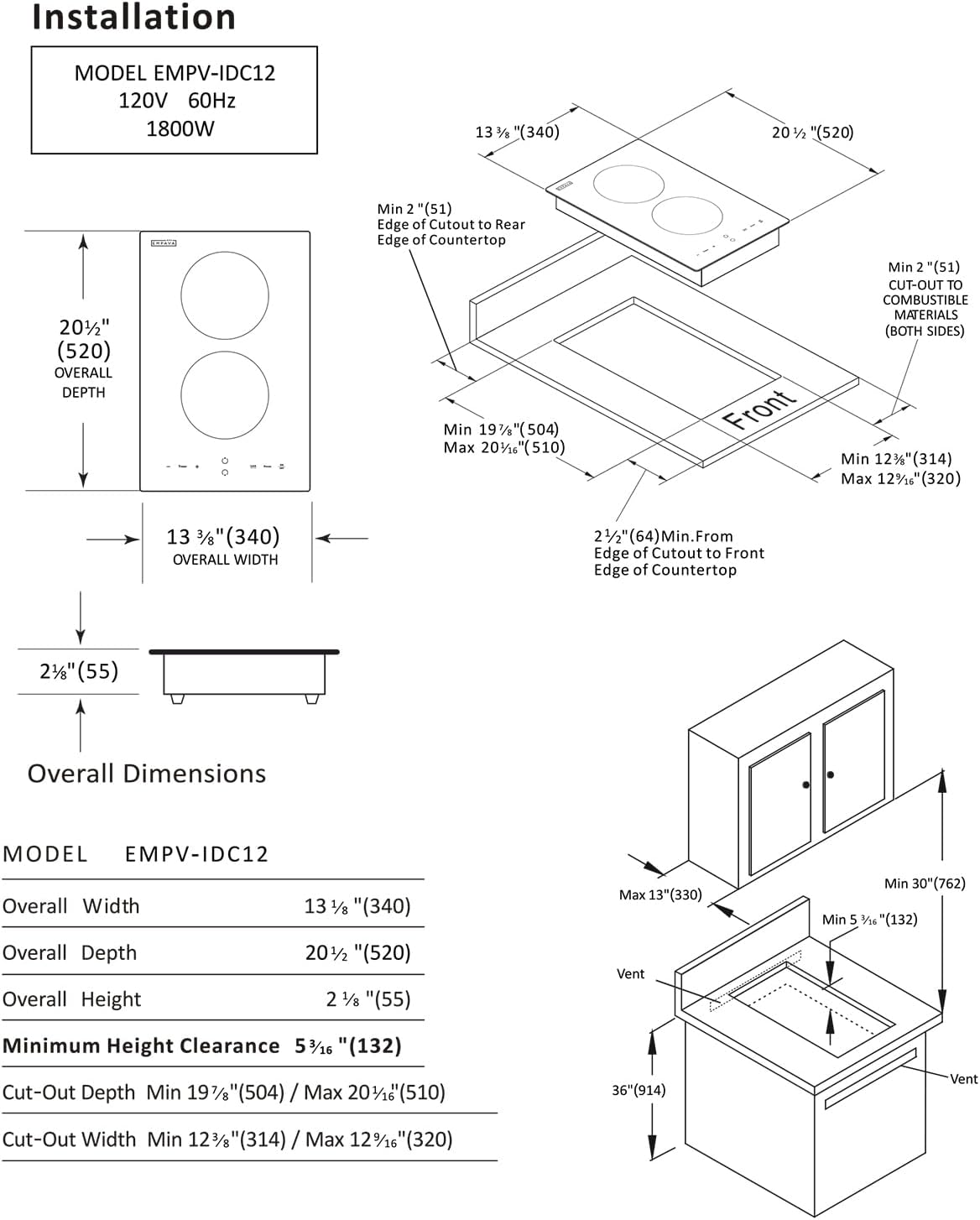 - Hassle-Free Installation: With a product dimension of 13.4 in. L x 20.5 in. D x 2.12 in. H and cutout dimensions of 12.4 in. L x 20 in. D., installation is a breeze. Comes with a pre-installed US standard 120v electrical plug; a 20-amp breaker is required. Start cooking with confidence with our Empava Induction Cooktop.