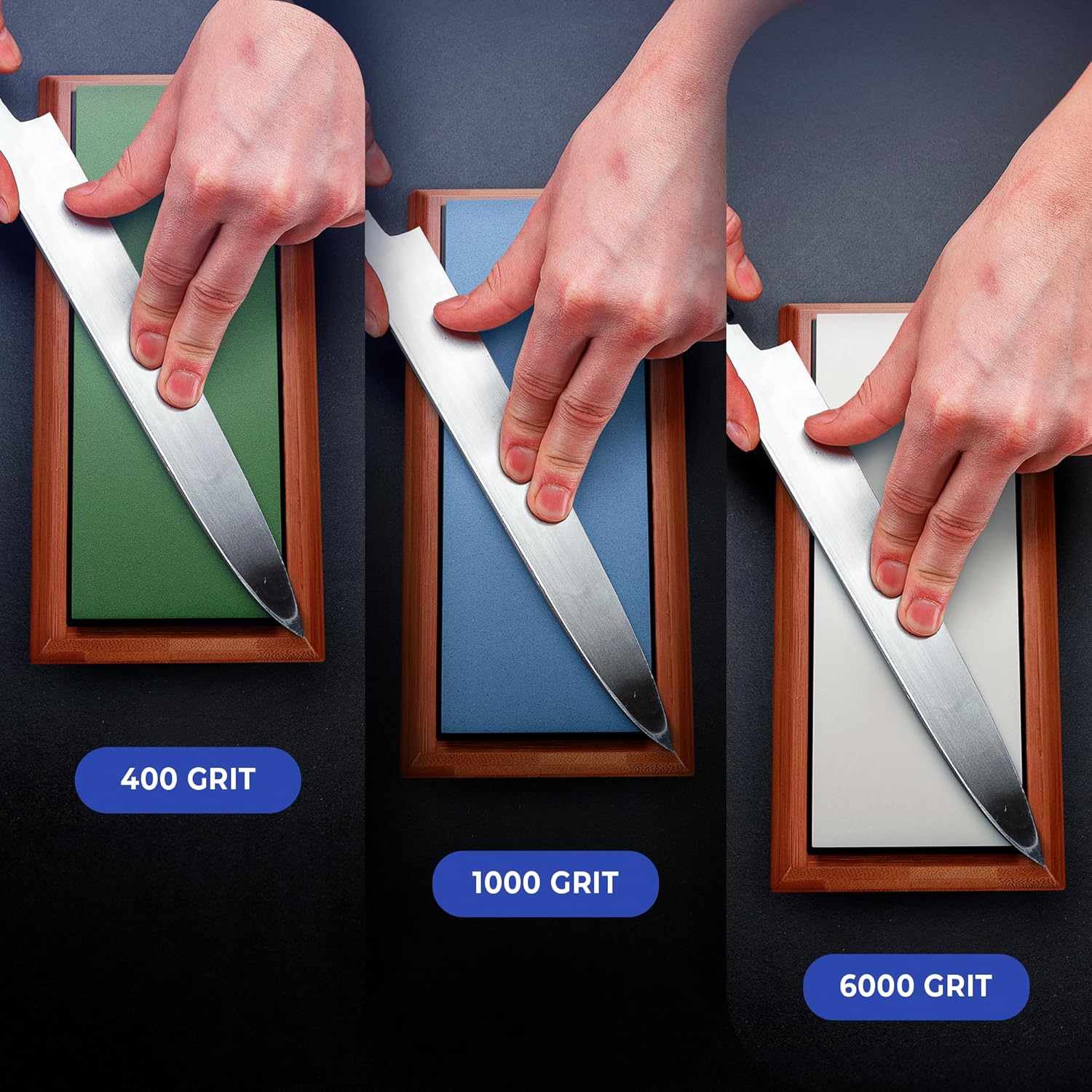 - Complete Sharpening Kit : This kit comes with 3 Grit 400/1000/6000 sharpening stones set well designed to achieve Razor Sharp Edge. The 400 grit is an aggressive stone for Dull Edges. The 1000 grit is used after the 400 or as a starting point for only moderately dull edges. The 6000 grit is a very fine stone and provides a very polished edge that will cut extremely well. It also includes handmade NonSlip Bamboo base making it a robust sharpening system