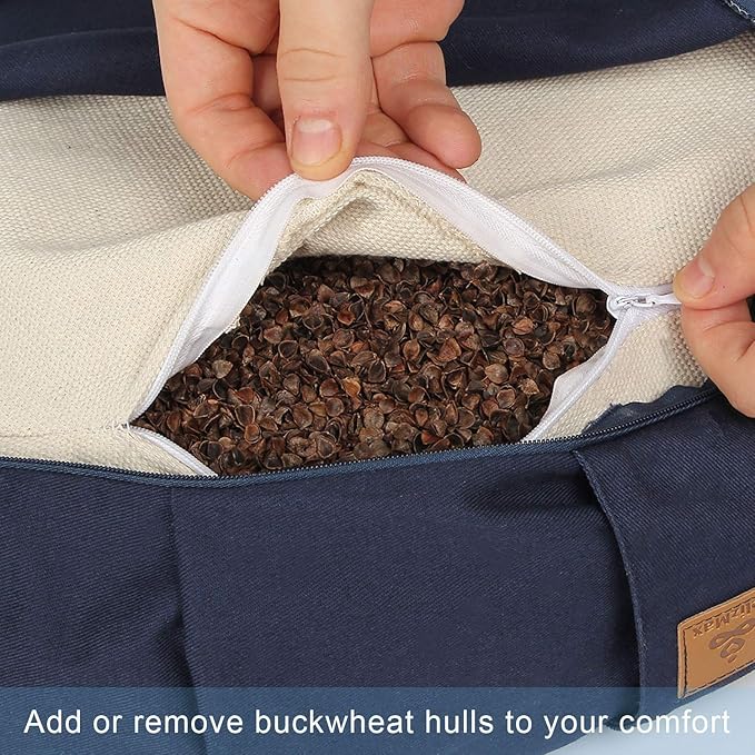 • CONVENIENT. Each zafu meditation cushion/pillow has sturdy carry handle for easy transport. The enough buckwheat hulls filling can be added or removed from zipper access to find the optimal level for your body. Organic cotton cover of Yoga bolster can be machine washed with cold water to reduce the risk of shrink or fade.