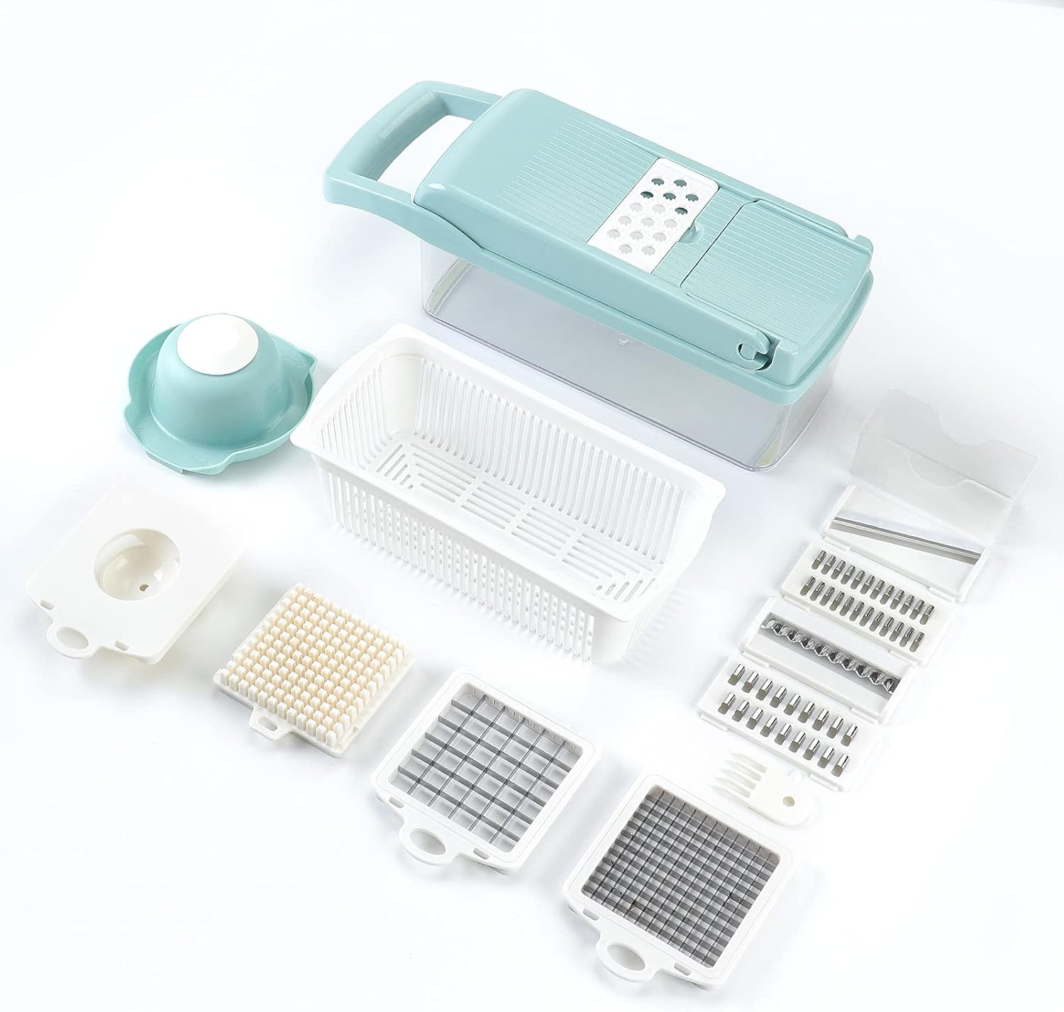 - 🧅12Piece and Versatile: Vegetable Chopper contains 5 Pic rectangular slicing blades, 3 Pic square chopping blades and egg strainer, 1 Pc hand guard, 1 Pc water filter basket, 1 Pc clear container, 1 Pc cleaning brush.