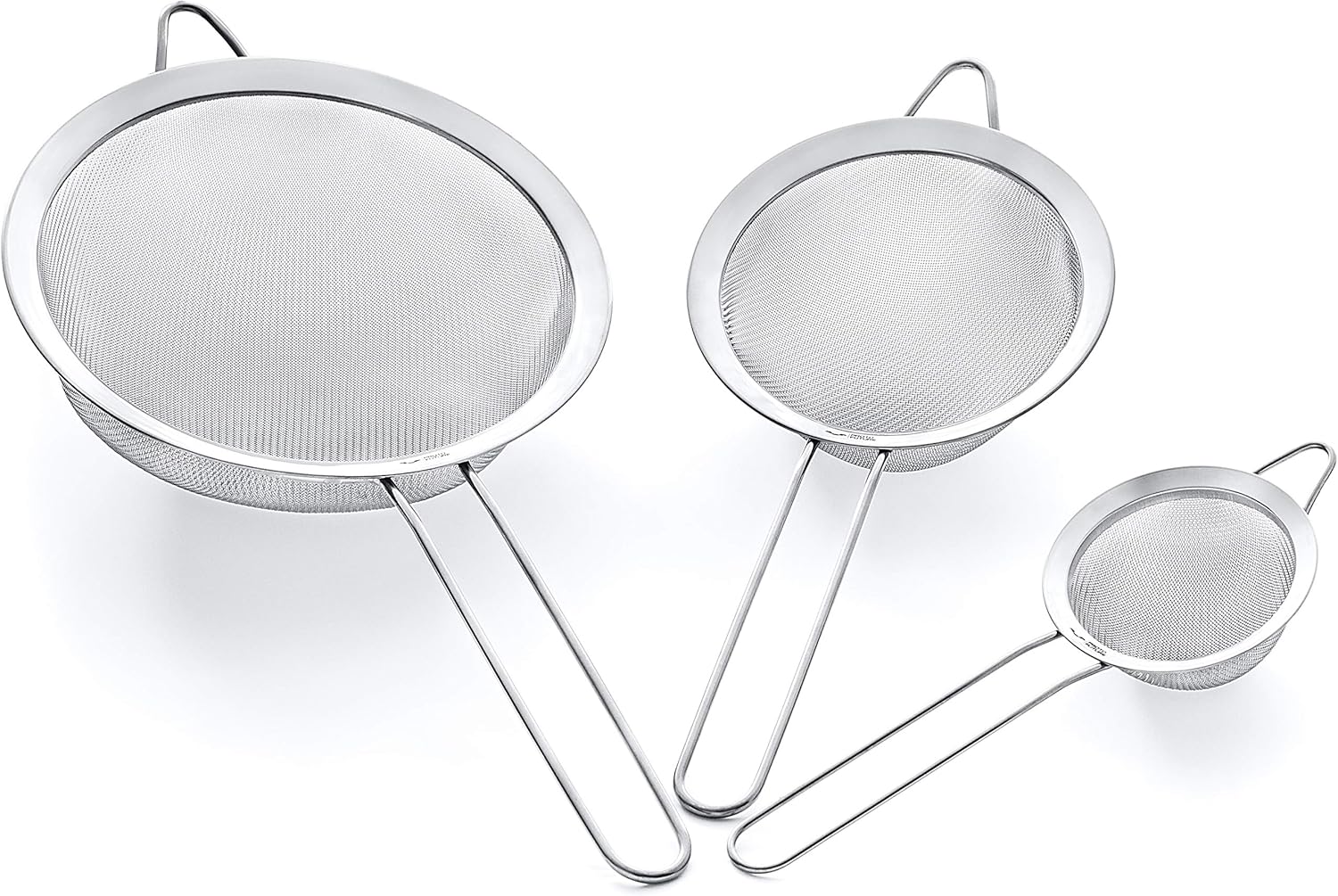 - 3.3″, 5.5″ & 8″ SIZES WITH FINE TWILL MESH - organise yourself with our professional quality kitchen strainer set of 3, 3.3″,5.5″ and 8″. Our unique strainers, larger than average sizes are versatile for a wide range of needs in the kitchen. Each strainer features fine twill mesh and a sturdy handle, so they can be hung or stacked for easy storage