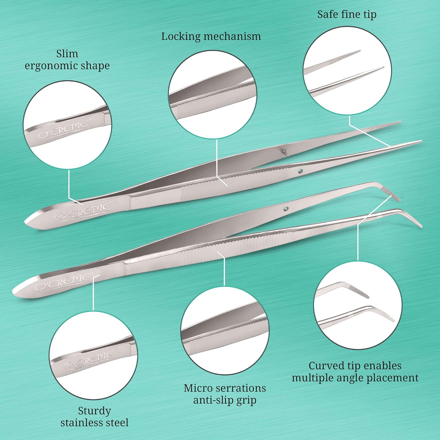 O'Creme Stainless Steel Precision Kitchen Culinary Fine-Tip Tweezer Tongs, 1 Curved and 1 Straight