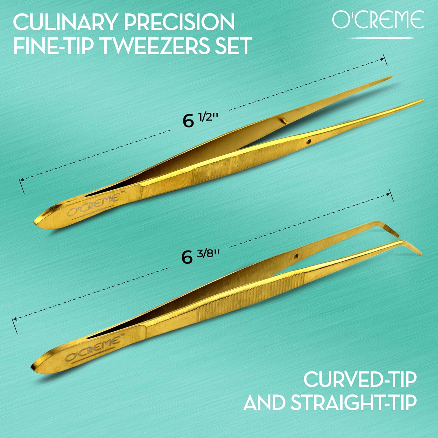O'Creme Gold Stainless Steel Precision Kitchen Culinary Fine-Tip Tweezer Tongs, 1 Curved and 1 Straight