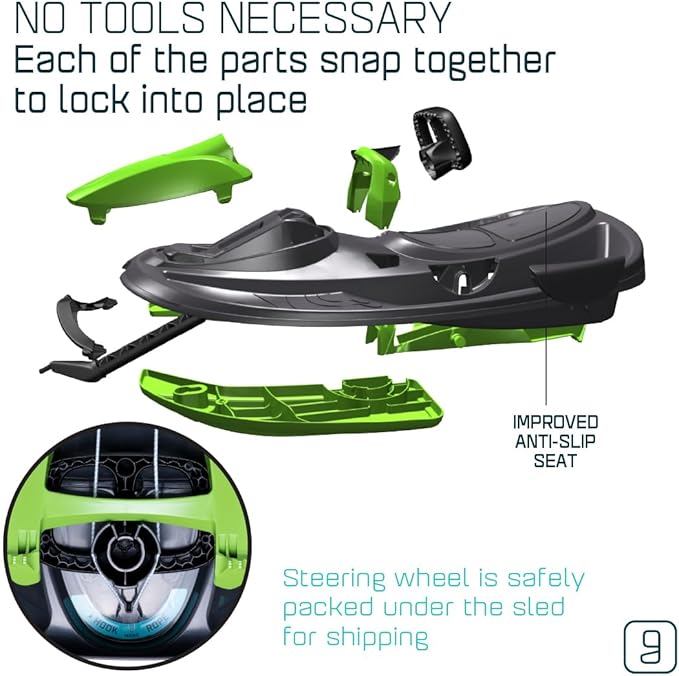 • STEERABLE SLED: The Steering Wheel offers excellent control for enhanced safety, is also connected to a locking differential steering system that provides the Stratos with the ability to maintain high speeds. The Anti-Slip Seat prevents kids from sliding