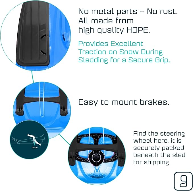 • SNOW SLED WITH BRAKES: A must-have for a safe and exhilarating sledding experience. The innovative design of the Stratos Snow Sled's brake system ensures that riders can easily stop, even on steep slopes
