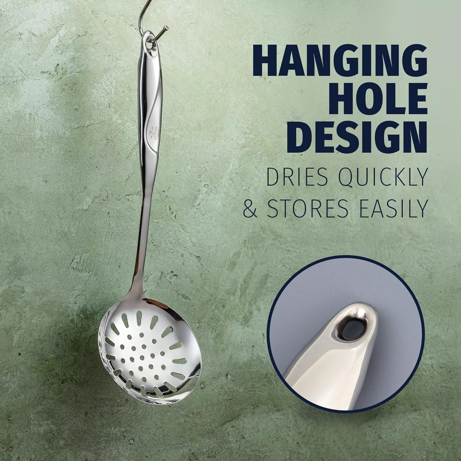- QUICK STRAINING: This skimmer spoon can be used to scoop out blanched vegetables, boiled or poached eggs, potatoes, or strain fried onions, filter chicken stock, and even for stir frying in the wok. The perfectly proportioned slots in our strainer ladle give a great liquid flow when straining or draining food.