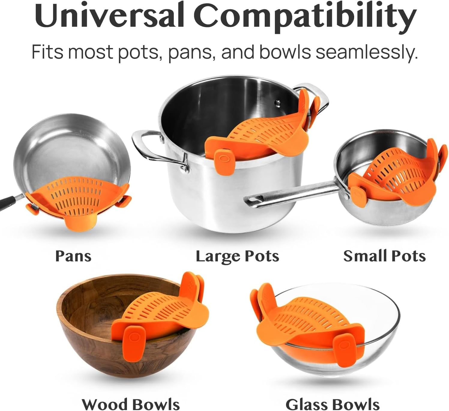 - Strong Grip, Universal Fit: Flexible clips latch onto most round cookware, making this silicone strainer great for pasta, veggies, and more; no spills or slipping