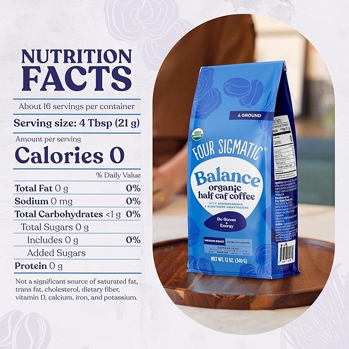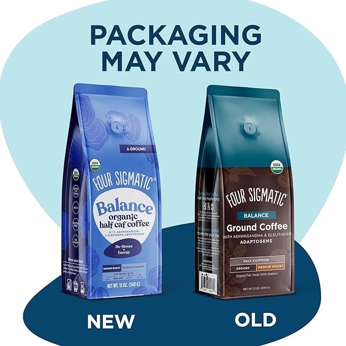 Four Sigmatic Organic Balance Adaptogen Ground Coffee | Medium Roast USDA Organic Coffee with Ashwagandha, Chaga Mushroom, Eleuthero and Tulsi for Focus and Energy Boosting | 12oz Bag