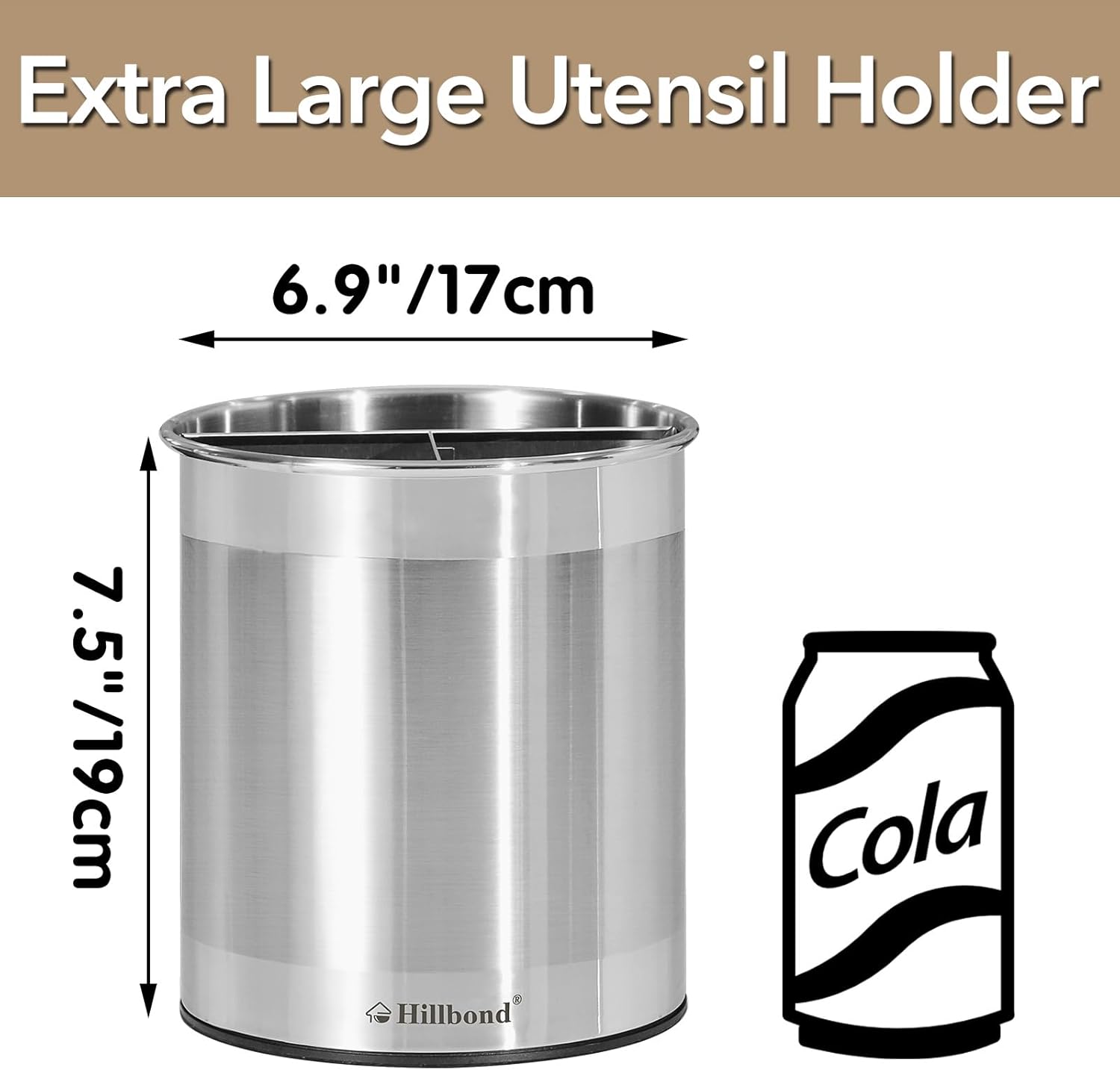 - EXTRA LARGE MEANS BIG: Hillbond large kitchen utensil holder is made of great quality and big in size, can hold plenty of cooking tools and utensil. And stainless steel kitchen utensil holder is tall enough to hold most long utensil.Stop cramming your utensils into small metal cups, or into a drawer that can barely close. 7.5*6.9 inches, super large for larger and longer cooking utensils